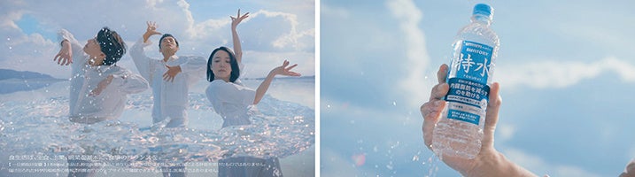 澄み渡る青空と湖面が織りなす幻想的な風景の中、3人の出演者がそれぞれの個性を生かしたウォーターダンスを披露します。広大な自然に溶け込むような動きとともに、水が生命を宿したかのように彼らの周囲を自由に巡り、時に寄り添い、時に躍動的に絡み合います。フラフープのようにお腹のまわりを巡る水の軌跡が、特別な水「特水」を象徴する、印象的なCMとなっています。