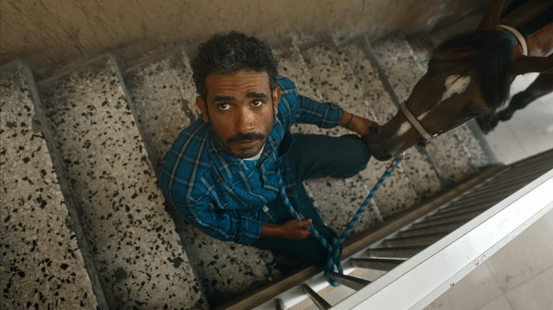男は愛馬と共に生きるため、狭い階段を登ろうとする。