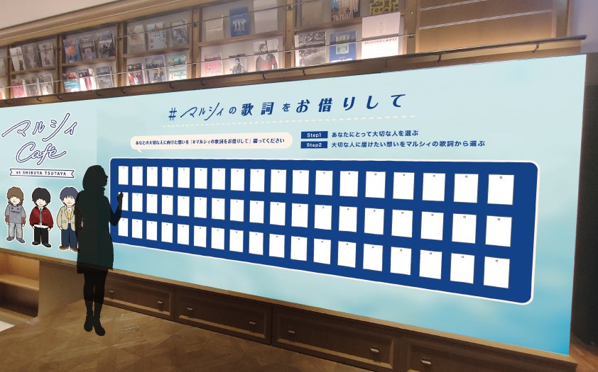 バレンタインをきっかけに、何かと愛や恋について語られる2月。共感性の高い歌詞で多くの若者を惹きつけてきたマルシィにぴったりなファン参加企画を開催いたします。企画名は【#マルシィの歌詞をお借りして】。カフェ内に展示されたメッセージボードに、あなたの”大切な人”に向けた想いを【#マルシィの歌詞をお借りして】綴っていただきます。純愛も失恋も友情も、そして選ぶ歌詞も全てご自由にお選びいただけます。