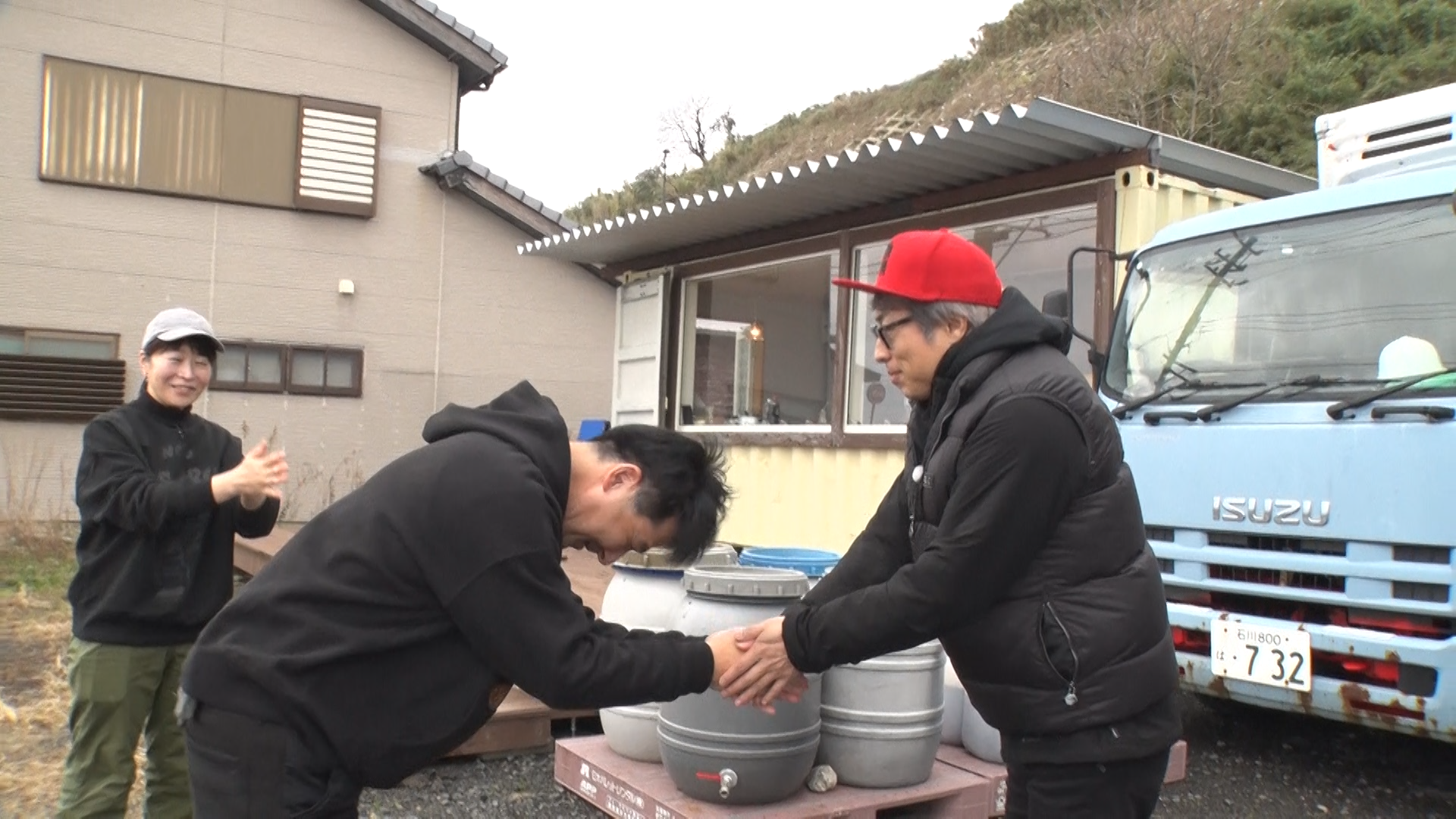 そんな中、淳の表情が飛び切りの笑顔に変わったのが、いしるを製造する「舳倉屋」の夫婦との再会。「久しぶりー!」と声をかけながら、がっちりと握手を交わします。
