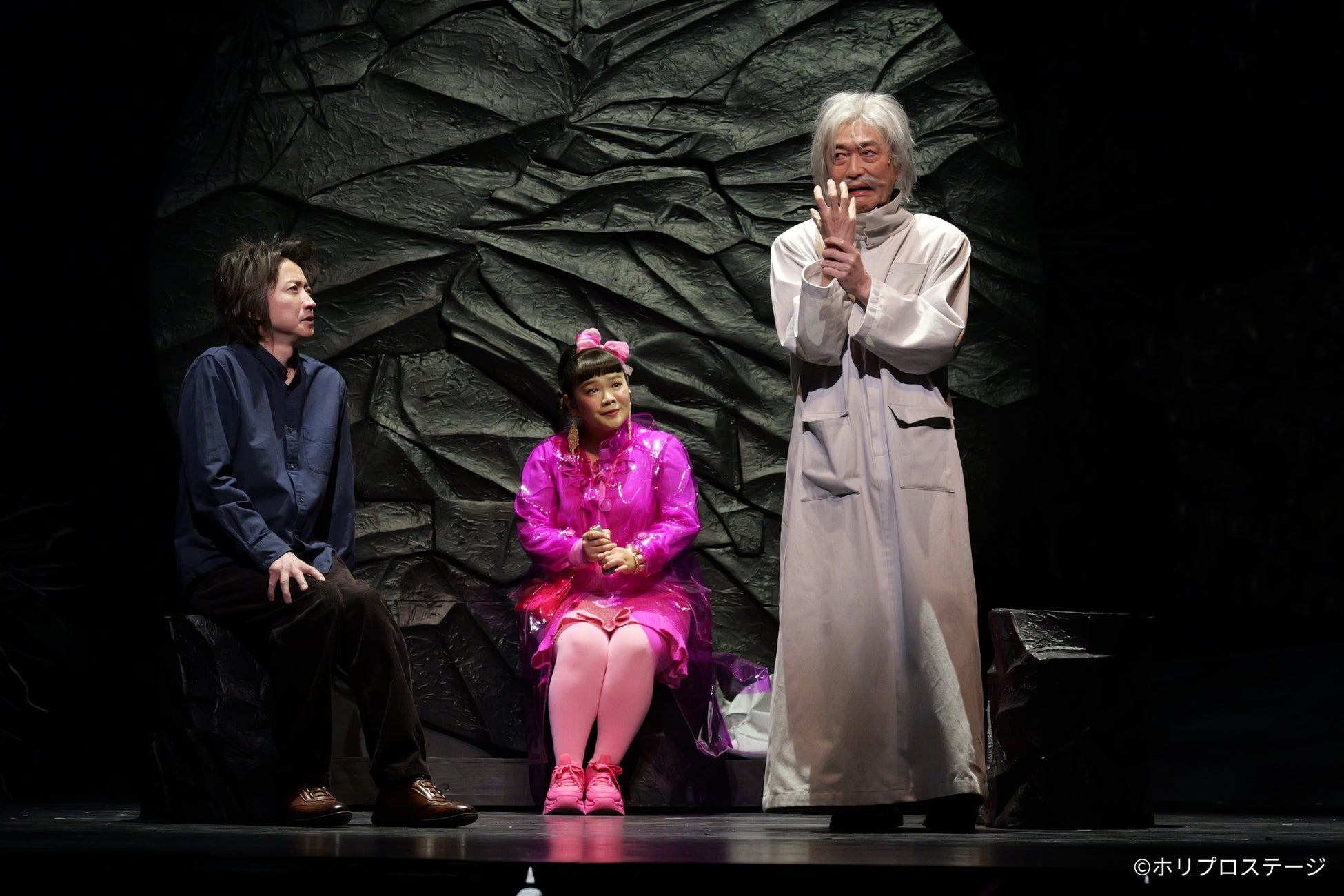 左から)私役:藤原竜也、ピンクの女役:富田富生、博士役:池田成志