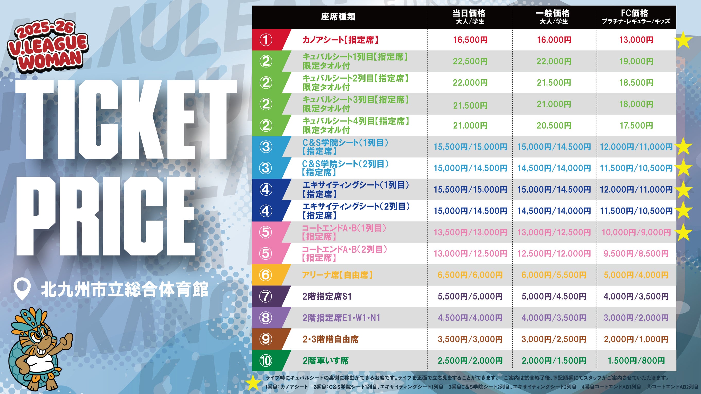 ※試合終了後、①カノアシート、③C&S学院シート、④エキサイティングシート、⑤コートエンドA、Bはキュバルシート側へ移動し、立ち見でライブを観賞することができます。