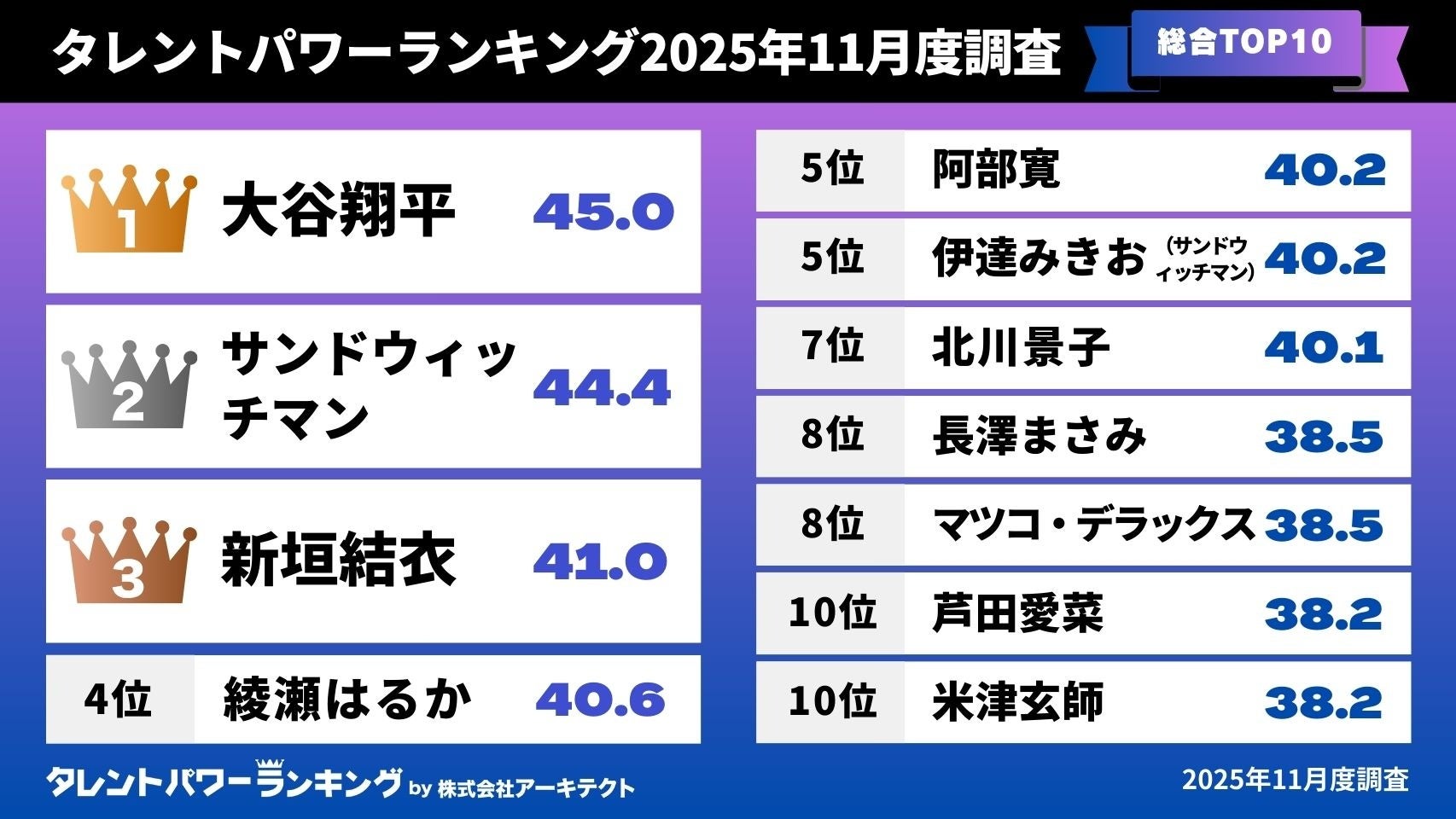 今回、株式会社アーキテクトが実施しているタレントパワーランキングの最新2025年第4四半期調査結果がまとまりました。