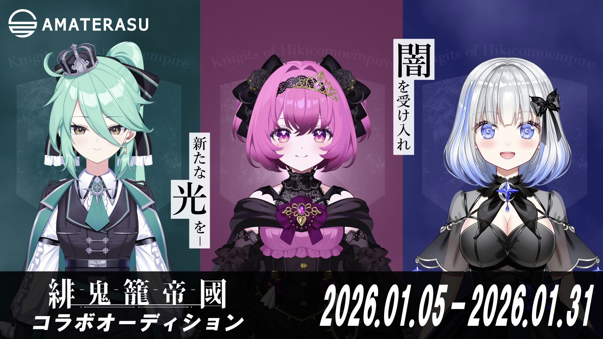 株式会社Virtual Peer Support LAB.(本社:広島県広島市、代表取締役:折笠一成、読み:バーチャルピアサポートラボ、以下「VPSL」)は、株式会社AMATERASU(本社:広島県広島市、代表取締役:緋鬼籠六花)所属のアイドルユニット緋鬼籠帝國とのコラボオーディションを1月5日(月)より開催いたします。なお、このオーディションで合格したメンバーは、VPSLが運営するひきこもりをコンセプトにしたVTuber事務所AMATERASUに所属することになります。