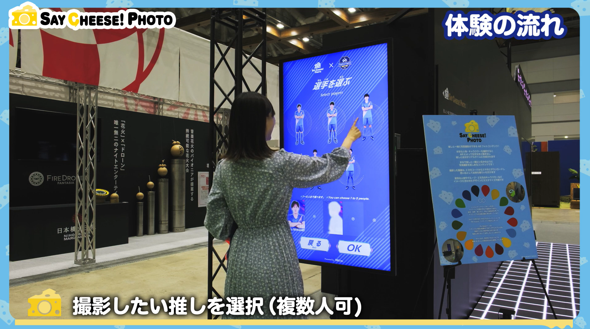 推しと一緒に写真撮影ができるAR(拡張現実)フォトコンテンツです。 好きな人物やキャラクターを選ぶとARによって生き生きと動き出すとともにリアルタイムに自分と合成され、まるで推しと一緒にいるかのような写真撮影を楽しめる体験型コンテンツです。撮影した写真は2次元コードからスマホにダウンロードし、思い出として持ち帰ることができます。