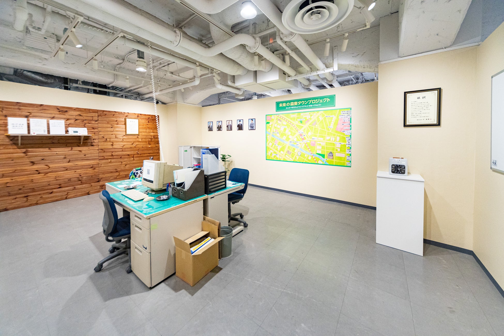 ザ・森東の歴史を知るエリアです。タイムカードで打刻後、各自学習してください。
