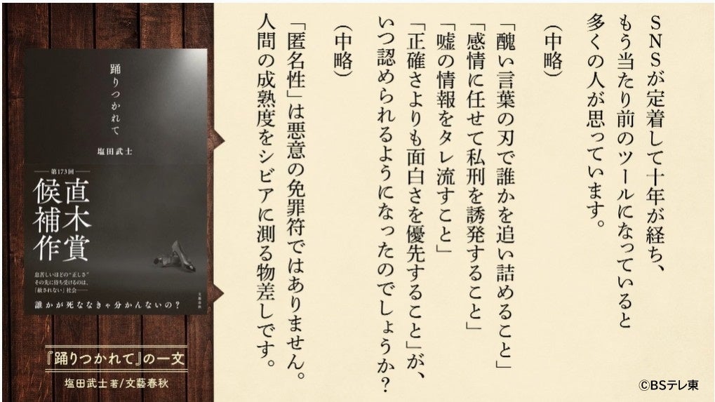 SNSでの苛烈な誹謗中傷に対し、ブログ上で【宣戦布告】という爆弾を落とし、83名の個人情報を晒した瀬尾が公判の場で語った言葉──「匿名性」は悪意の免罪符ではありません。人間の成熟度をシビアに測る物差しです。──これを手帳にメモしやすいように省略した一文です。SNSに投稿するときは、常にこの「名言」を1回読んでから行ったほうがいい、という思いを込めて選出いたしました。(番組プロデューサーより)