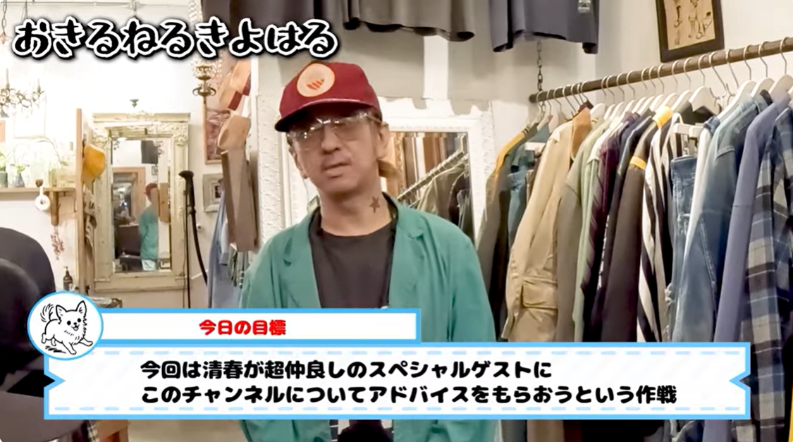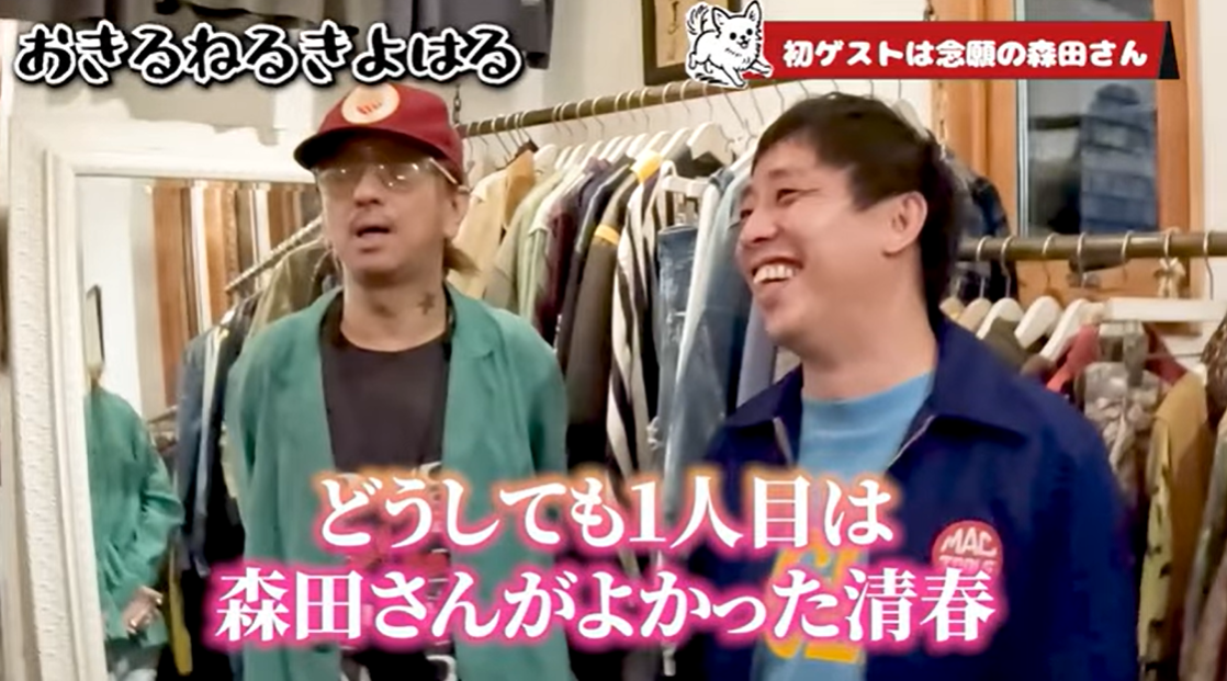 記念すべき第1回配信の前半では、チャンネル名を決める様子や、今後の配信に向けた思いが語られました。ネーミング案を巡るやり取りでは、清春らしい視点による案も挙がり、チャンネルの空気感が伝わる導入回となっています。後半では、初ゲストとして男性層から絶大な支持を集めるお笑いコンビ「さらば青春の光」の森田哲矢氏を迎え、古着ショップ「RUMHOLE beruf」にて古着選びロケを実施しました。YouTube界の先輩である森田氏からアドバイスをもらう狙いでスタートした本企画は、冒頭から森田氏による率直なガチダメ出しが飛び出します。試着を重ねながらトークが進み、二人ならではの掛け合いや思わぬリアクションも次々と描かれる内容です。