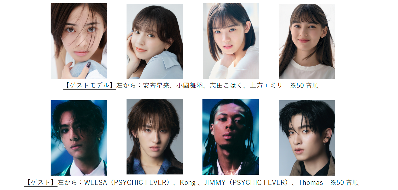 ゲストモデルには、モデルとしてファッションショーでは圧巻のスタイルを披露する一方、日曜劇場『御上先生』や映画『カラダ探し THE LAST NIGHT』など、女優としても活躍の幅を広げている安斉星来、雑誌『Seventeen』専属モデルとして活躍する一方、ABEMAの⼤⼈気恋愛リアリティーショー『今日、好きになりました。』で人気を集めた小國舞羽、スーパー戦隊シリーズ『暴太郎戦隊ドンブラザーズ』でデビューを果たし、ドラマ『なんで私が神説教』や、ショートドラマアプリ『BUMP』で史上最速&最⼤ヒットを記録した『プロ彼⼥の条件』に出演、さらに、現在放送中のスーパー戦隊シリーズ最新作『ナンバーワン戦隊ゴジュウジャー』にも出演するなど、今後のさらなる活躍が期待される志⽥こはく、2018年にNHK Eテレ「Eダンスアカデミー」にてデビューを果たすと、ドラマ『相棒 season20』やNHK Eテレ『高校講座 地理探求』などに出演し、女優・タレントとして活躍する一方、モデルとしてもファッションショーや雑誌『CanCam』『ViVi』に度々登場している土方エミリの出演が決定しました!