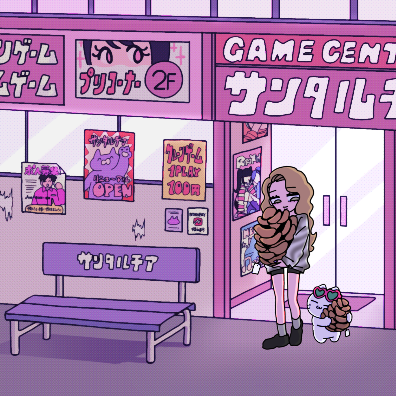 作品の中でギャルとツナがまつぼ(まつぼっくり)のぬいぐるみを獲得したゲームセンター「サンタルチア」をイメージした内装となっており、実際に遊びに来たような気分を味わうことができます。会場内には、フォトスポットとして二人が座っておしゃべりしていたお店のベンチも登場。ベンチに座っているツナと一緒に、記念撮影をすることができます。
