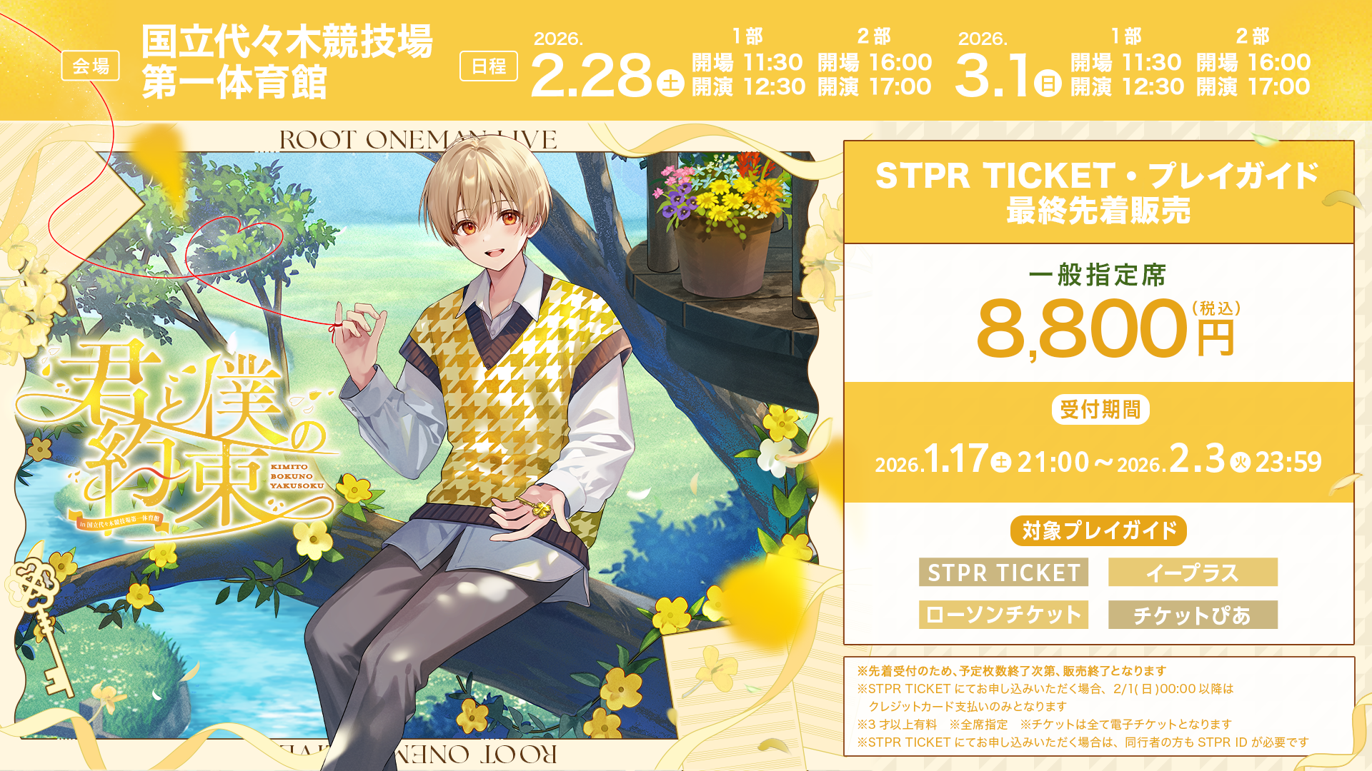 株式会社STPR (本社:東京都渋谷区 代表:柏原真人、以下「STPR」)は、弊社所属の2.5次元アイドルグループ「すとぷり」の「るぅと」のワンマンライブ『君と僕の約束 in 国立代々木競技場第一体育館』(2026年2月28日(土)、3月1日(日)開催)について、STPR TICKET・プレイガイド最終先着販売を2026年1月17日(土)に開始したことをお知らせいたします。