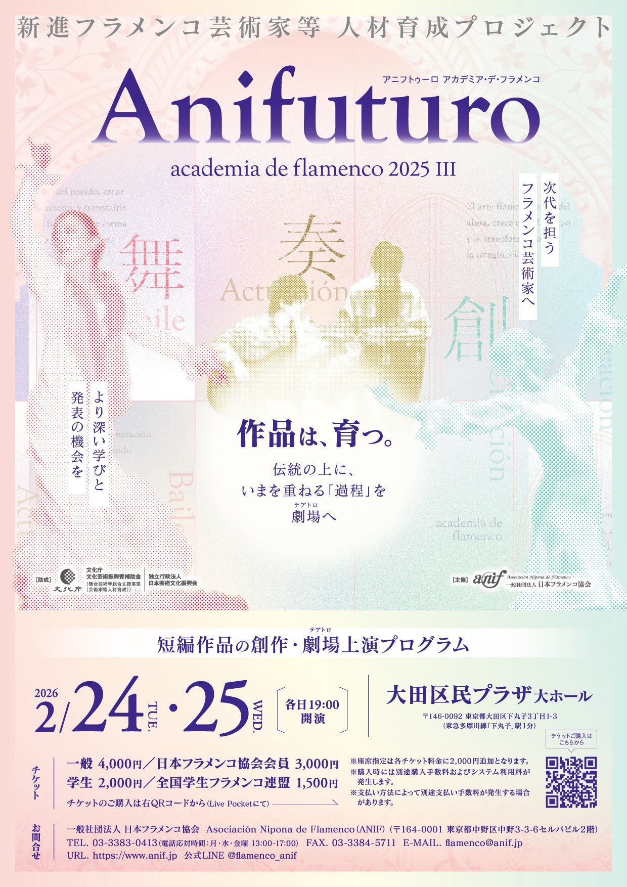 一般社団法人日本フラメンコ協会(東京都中野区、理事長:鍵田真由美)は、2026年2月24日(火)・25日(水)の2日間、大田区民プラザにて、新進フラメンコ芸術家育成プロジェクトの成果発表公演『Anifuturo – academia de flamenco 2025 Ⅲ』を開催いたします。