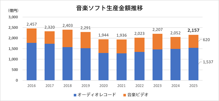2025年年間の音楽ソフト(オーディオレコード・音楽ビデオの合計)生産実績は、数量で前年比101%の1億4,302万枚・巻、金額で同105%の2,157億円といずれもプラス成長を記録し、4年連続で2,000億円台を維持しています。