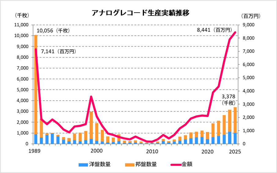 日本レコード協会加盟全社の集計による2025年年間(1月~12月)の音楽ソフト生産実績がまとまりましたのでお知らせいたします(当協会会員社が受託した非会員社の販売受託分を含みます)。