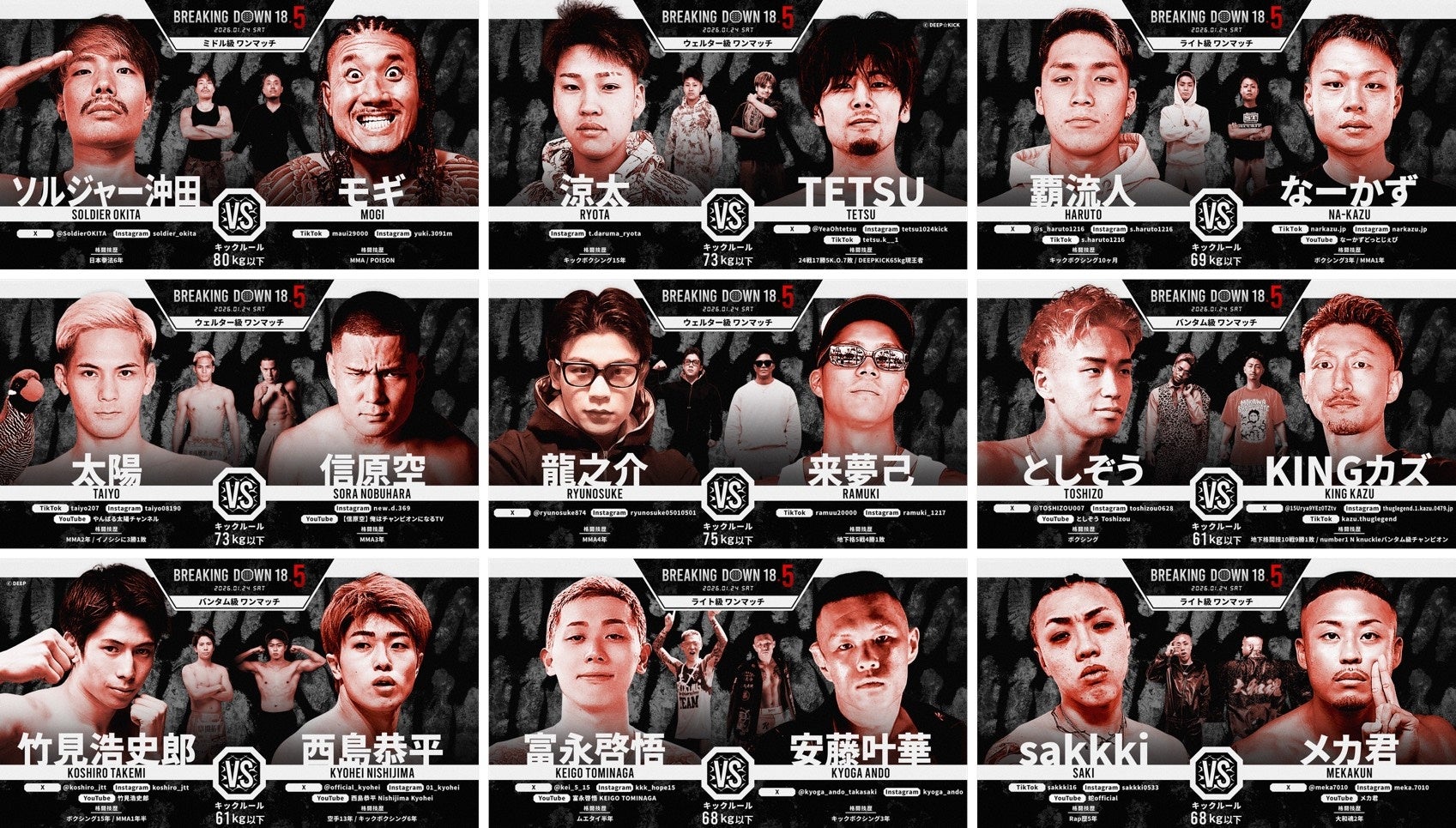 BreakingDown株式会社(本社:東京都港区、代表取締役:朝倉未来)は、2026年1月24日(土)に開催する格闘技イベント『ポスティングホールディングス presents BreakingDown18.5』の全対戦カードを発表したことをお知らせいたします。