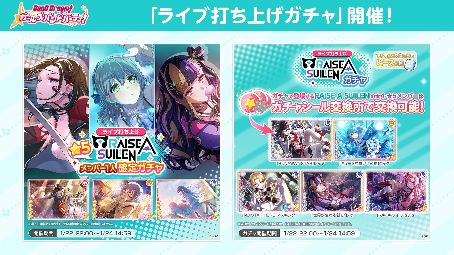 本ライブ開催を記念して、スマートフォン向けゲーム「バンドリ! ガールズバンドパーティ!」内で、「ライブ打ち上げガチャ」が開催中です。RAISE A SUILENメンバーの出現率がアップするほか、様々なアイテムと交換できるピース付きとなります。