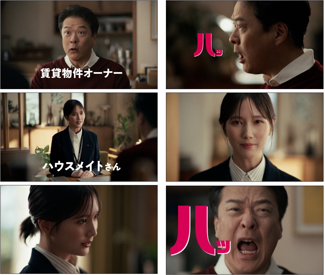 CMシリーズのテーマは「ハッと驚くハウスメイトに」。「ハッと驚く オーナー」篇ではハウスメイトの社員・エリアアドバイザー役の本田翼さんが、賃貸オーナー役の田中哲司さんに対し、不動産売買、相続、資産承継等、さまざまな提案をします。物件のことのみならず、将来を先回りをした鋭い提案をする本田さんを前に、田中さんが終始「ハッ!」と驚くシーンと、ラストの決めゼリフが見どころです。