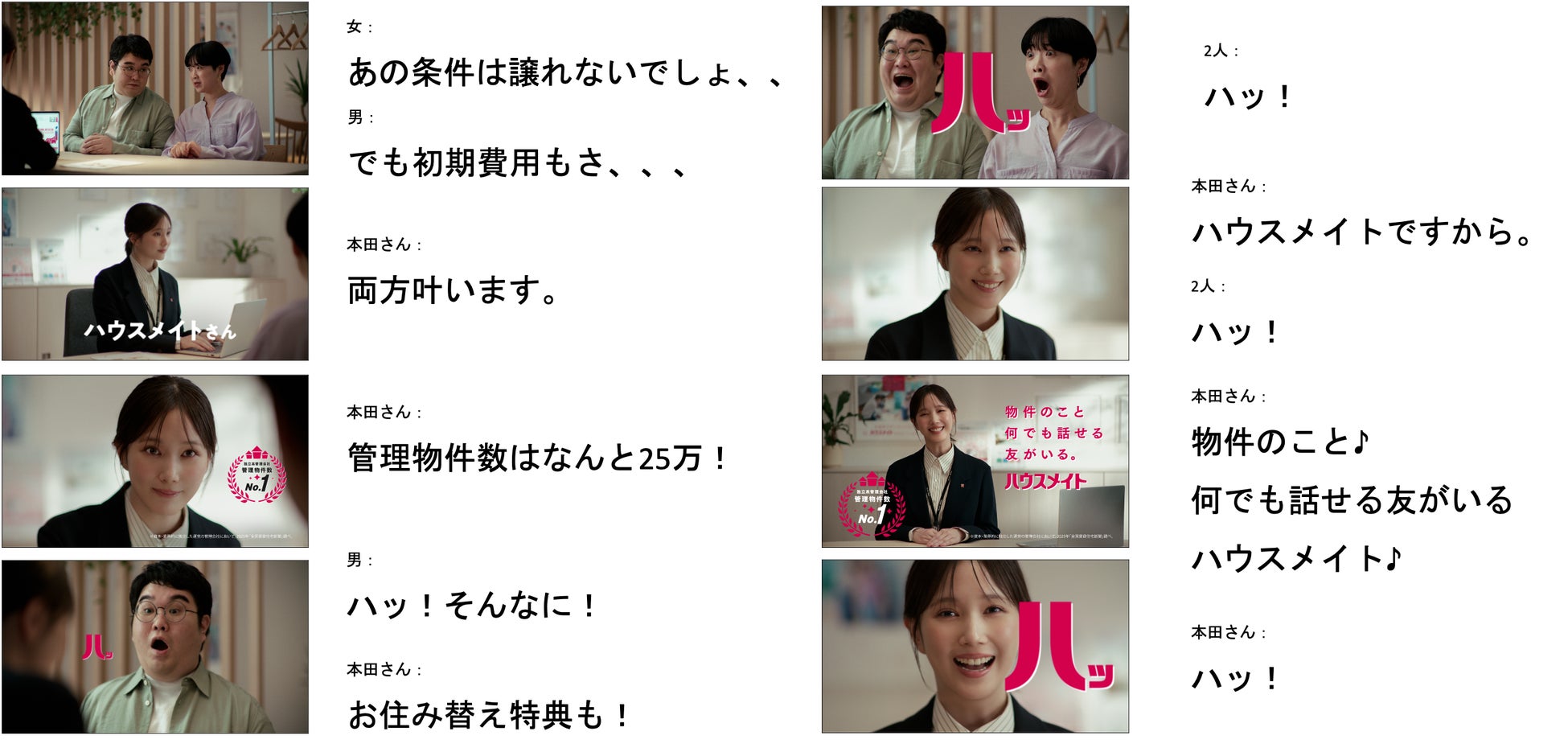 「ハッと驚く カップル」篇は、次に住む物件を探すカップルがハウスメイトの店舗に訪れるシーンから物語ははじまります。ハウスメイトのショップスタッフを演じる本田さんは、カップルが譲れない条件をボソボソとつぶやく様子をみると、「両方叶います!」と自身満々に説明。思わず「ハッ」と驚く彼氏に畳み掛けるように、物件探しにおけるハウスメイトの強みを伝えます。住み替え特典やアフターサポートなど、住んでからも嬉しい点を次々とプレゼンテーションしていくと、彼女の母が突如現れ、3人揃って「ハッ」とします。