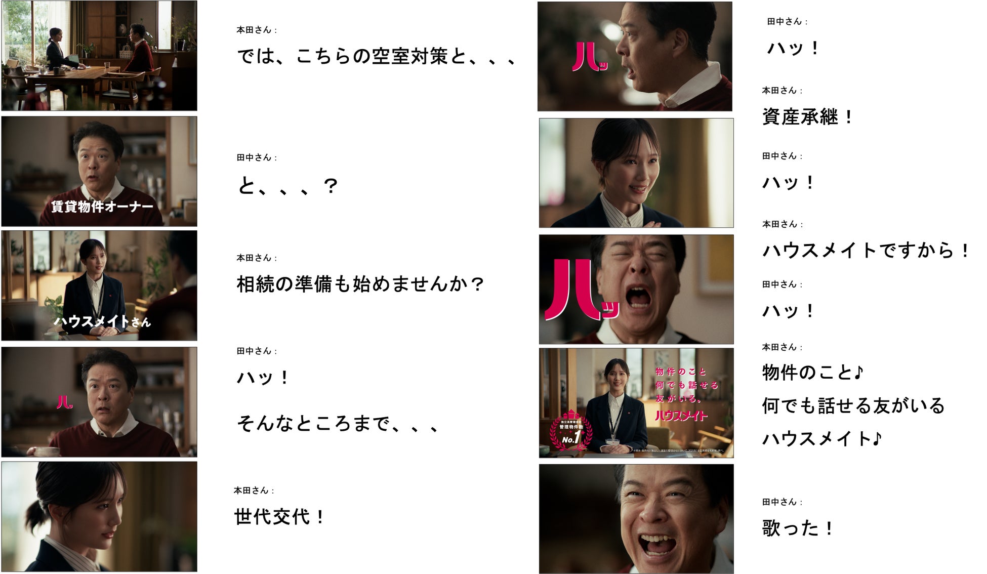 最後に、本田さんが微笑みながら、「物件のこと、何でも話せる友がいる。ハウスメイト♪」と歌います。その様子に田中さんは思わず、「ハッ!歌ったあ!(15秒版)」と、最後まで圧倒される展開となっています。