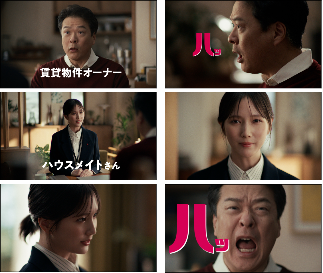 CMシリーズのテーマは「ハッと驚くハウスメイトに」。「ハッと驚く オーナー」篇ではハウスメイトの社員・エリアアドバイザー役の本田翼さんが、賃貸オーナー役の田中哲司さんに対し、不動産売買、相続、資産承継等、さまざまな提案をします。物件のことのみならず、将来を先回りをした鋭い提案をする本田さんを前に、田中さんが終始「ハッ!」と驚くシーンと、ラストの決めゼリフが見どころです。