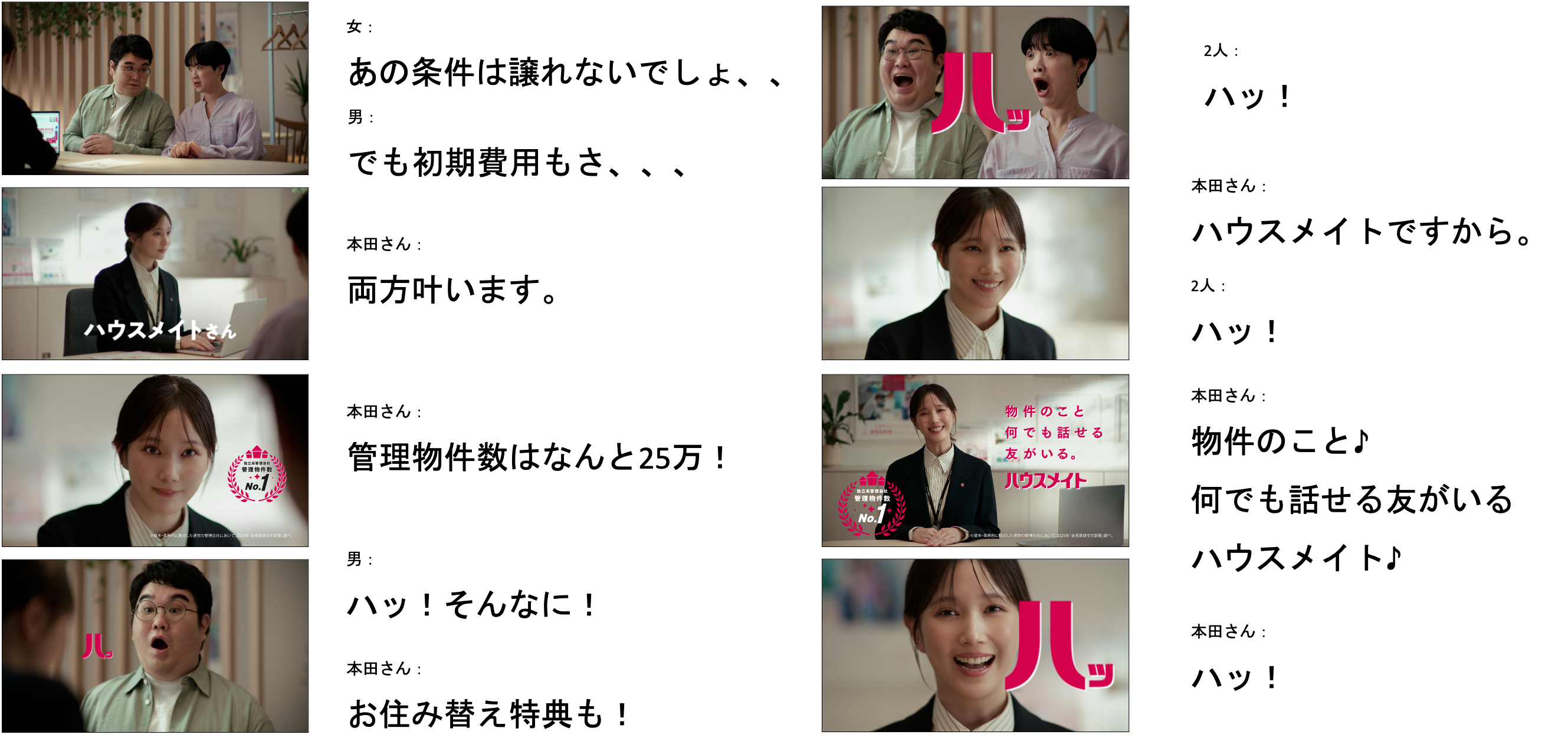 「ハッと驚く カップル」篇は、次に住む物件を探すカップルがハウスメイトの店舗に訪れるシーンから物語ははじまります。ハウスメイトのショップスタッフを演じる本田さんは、カップルが譲れない条件をボソボソとつぶやく様子をみると、「両方叶います!」と自身満々に説明。思わず「ハッ」と驚く彼氏に畳み掛けるように、物件探しにおけるハウスメイトの強みを伝えます。住み替え特典やアフターサポートなど、住んでからも嬉しい点を次々とプレゼンテーションしていくと、彼女の母が突如現れ、3人揃って「ハッ」とします。