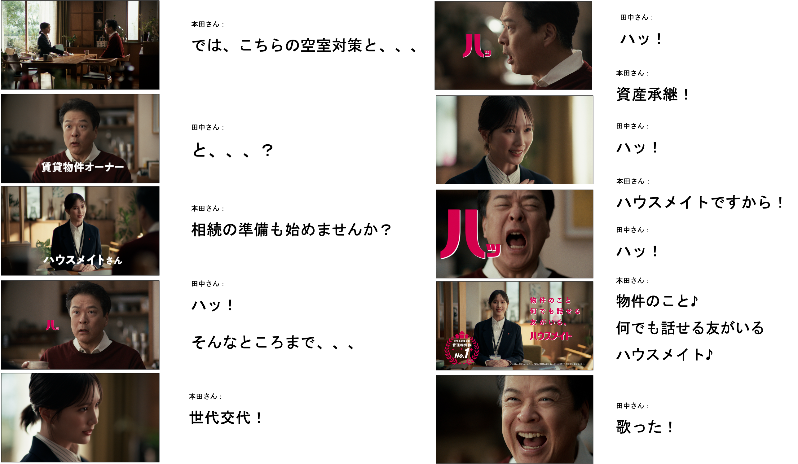 一方で本田さんには、ハウスメイトが長年培ってきた「オーナーに寄り添うサポート力」が身についています。空室対策から修繕、建て替え、さらには資産承継に至るまで、「すべてお任せください」と力強く言い切る本田さんの様子に、田中さんはただ「ハッ」と、驚くばかりです。