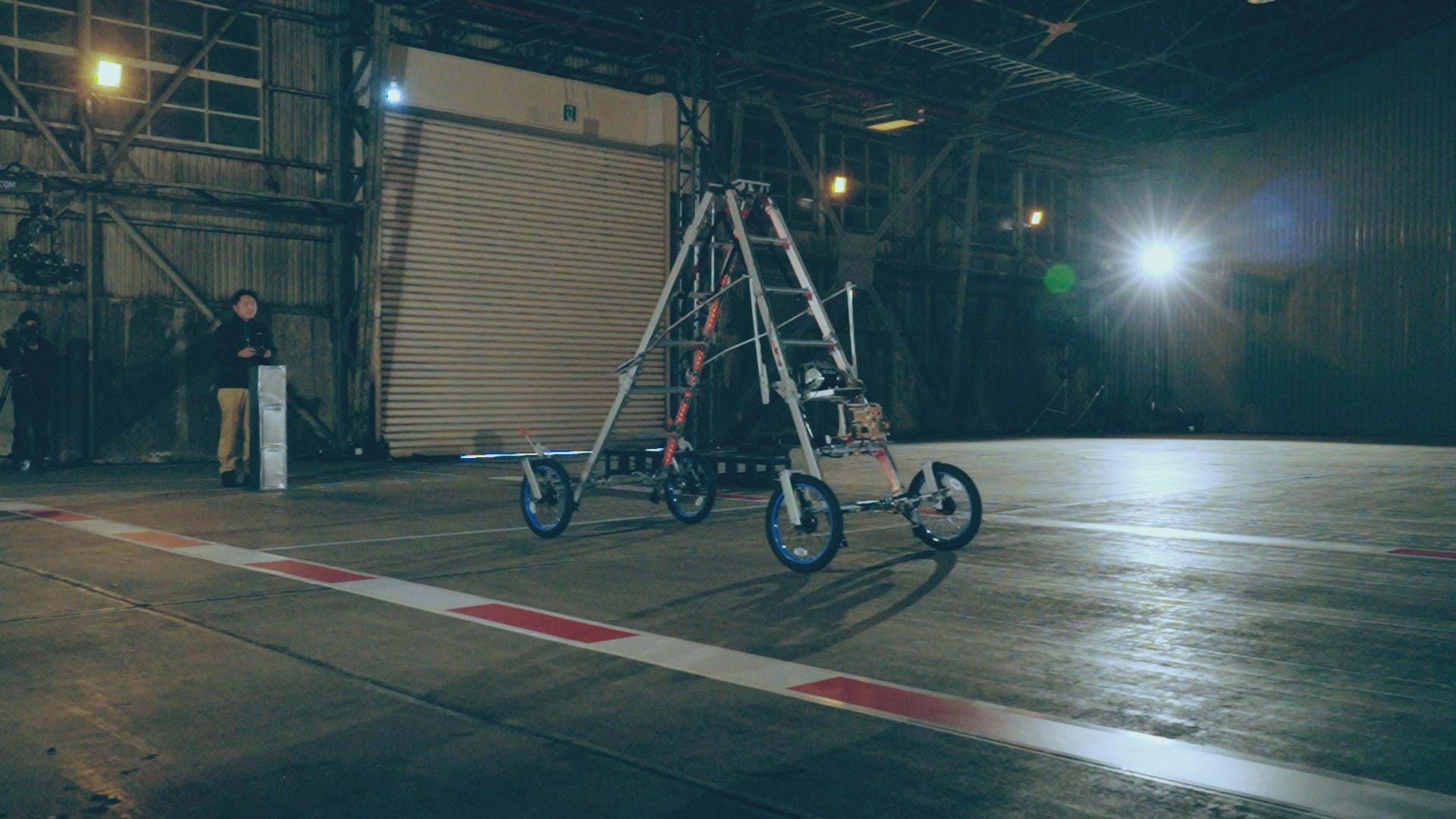 “脚立”が25mを爆走する! “キックスケーター“が自立して綱渡り!