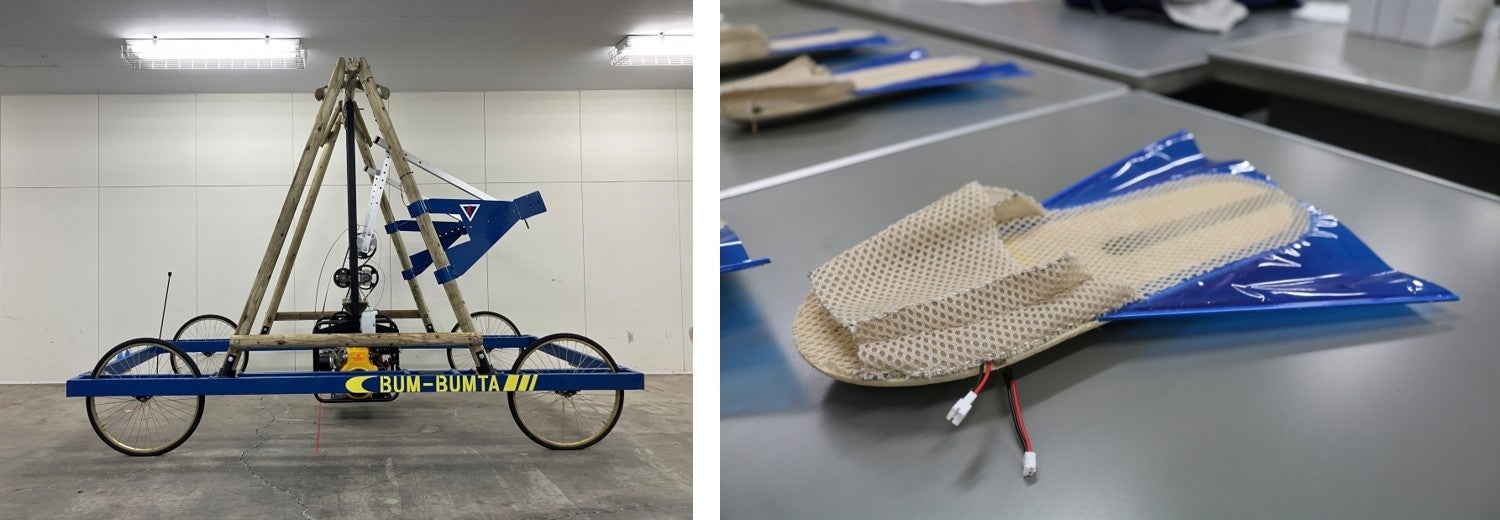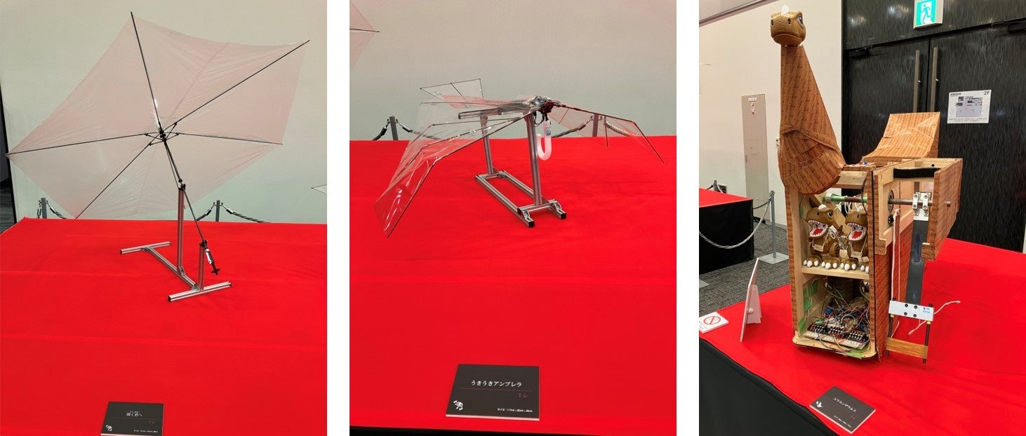 Tレが開発した3体のモンスター。恐竜ちゃん缶蹴りの「ユウカンザウルス」は、“優しく蹴る”をコンセプトに、炭素繊維、金属、木材等の素材の複合化で実現。ビニール傘滞空マッチの「開く君へ」は“極限の軽さを追及”し、骨組みからビニール全ての素材を1g単位で追い込んだ。一方「うきうきアンブレラ」は動的な羽ばたきを採用し、まさに“鳥が飛ぶ”が如く空を翔ける。素材の知識を十二分に注いだモンスター達をご覧下さい。