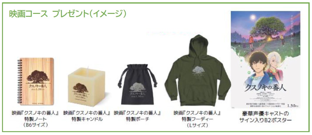 ・豪華声優キャストのサイン入りB2ポスター 3名様 ・映画『クスノキの番人』特製フーディー(Lサイズ) 5名様 ・映画『クスノキの番人』特製ノート(B6サイズ) 12名様 ・映画『クスノキの番人』特製キャンドル 5名様 ・映画『クスノキの番人』特製ポーチ 5名様 |