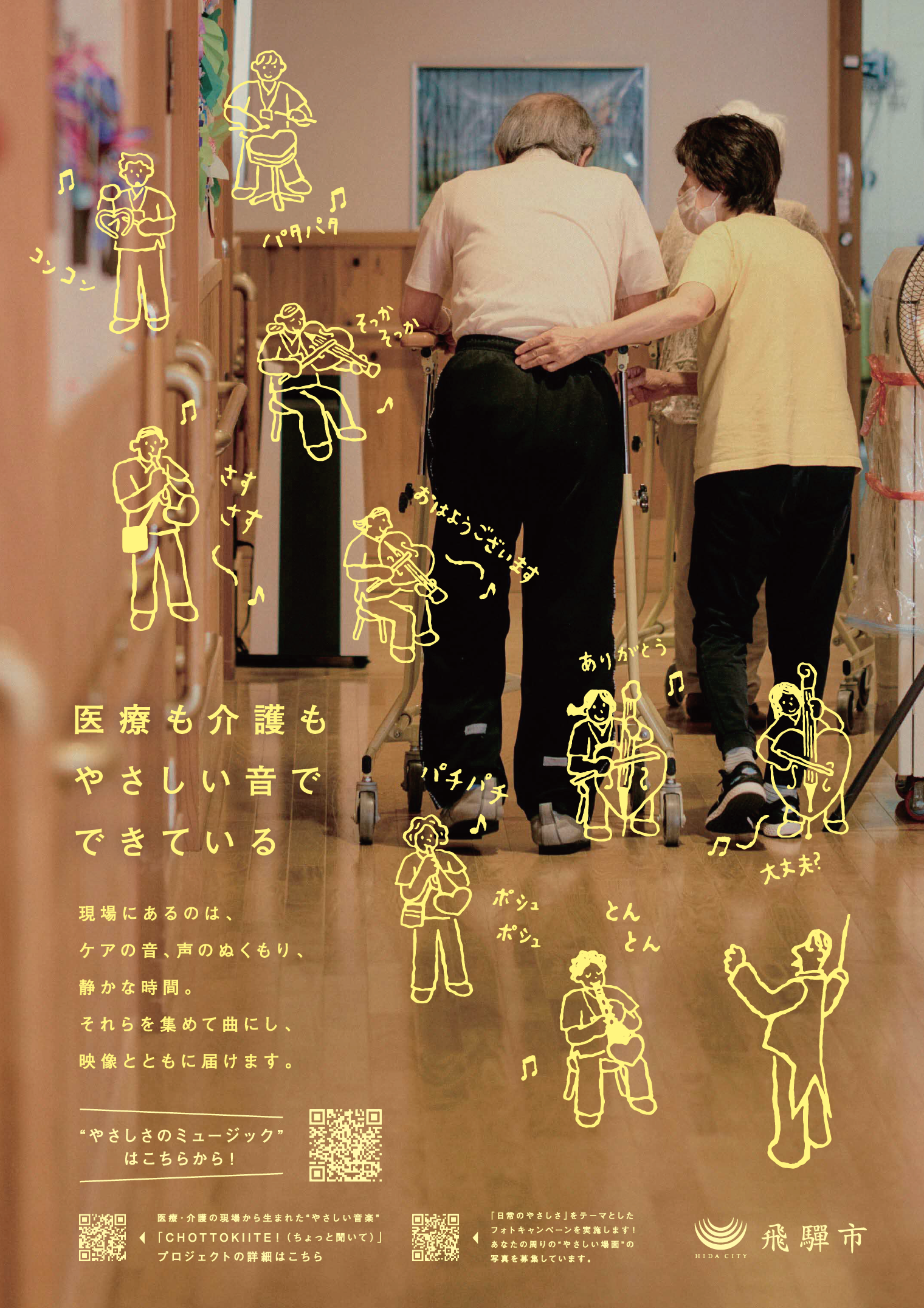 岐阜県飛騨市(市長:都竹淳也)は、医療・介護の現場でスタッフや利用者が交わす声や仕草、その一つひとつが現場で働く人々の日々の支えとなっていることに着目し、現場のリアルな音や映像を通して、“やさしさ”のかたちを丁寧に伝えたいという思いから作品を制作しました。