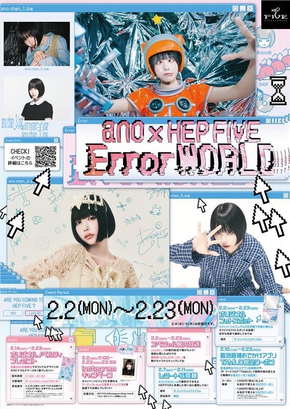 阪急阪神ビルマネジメント株式会社(所在地:大阪市北区、代表取締役:北野 研)が運営する大阪・梅田のファッションビル「HEP FIVE」では、2026年2月2日(月)~2月23日(月・祝)の期間中、メインビジュアルにアーティストano(通称:あのちゃん)を起用し、期間限定キャンペーン「ano×HEP FIVE Error WORLD」を実施いたします。