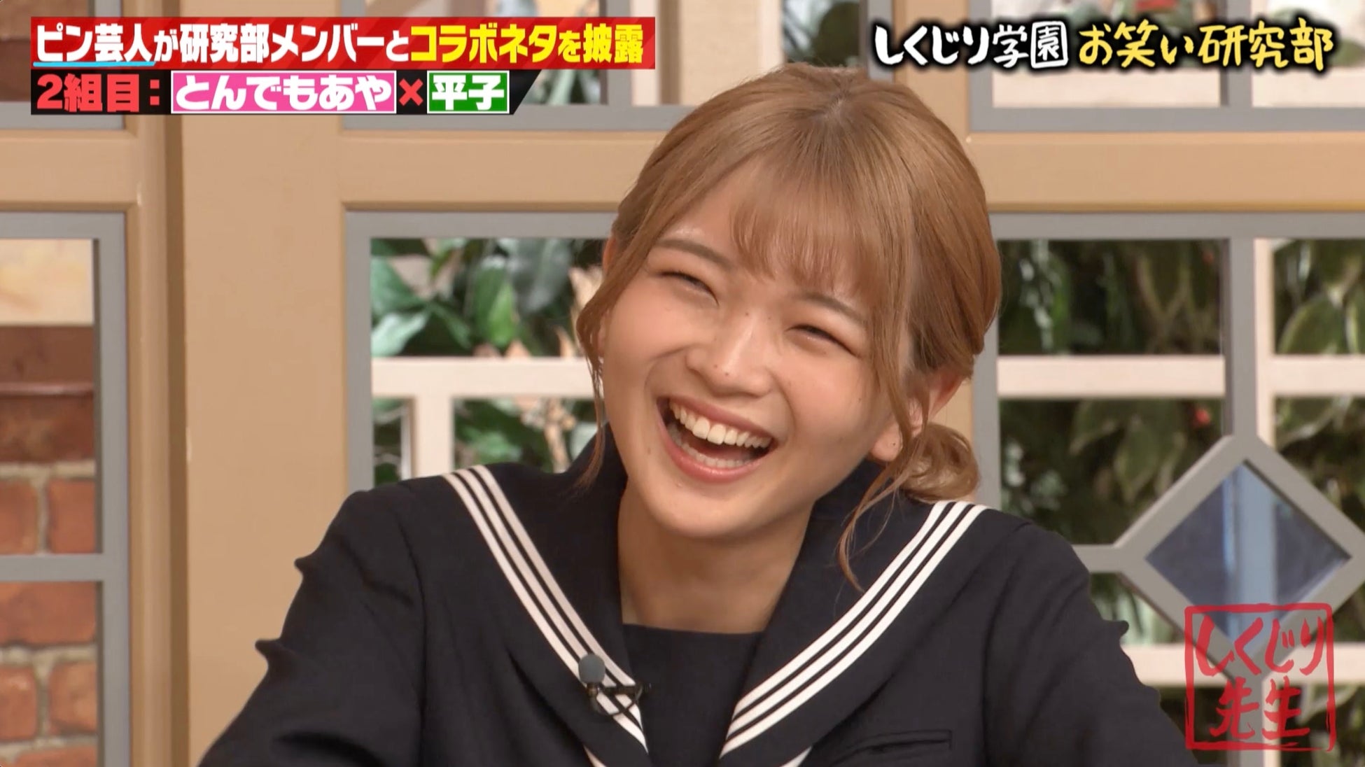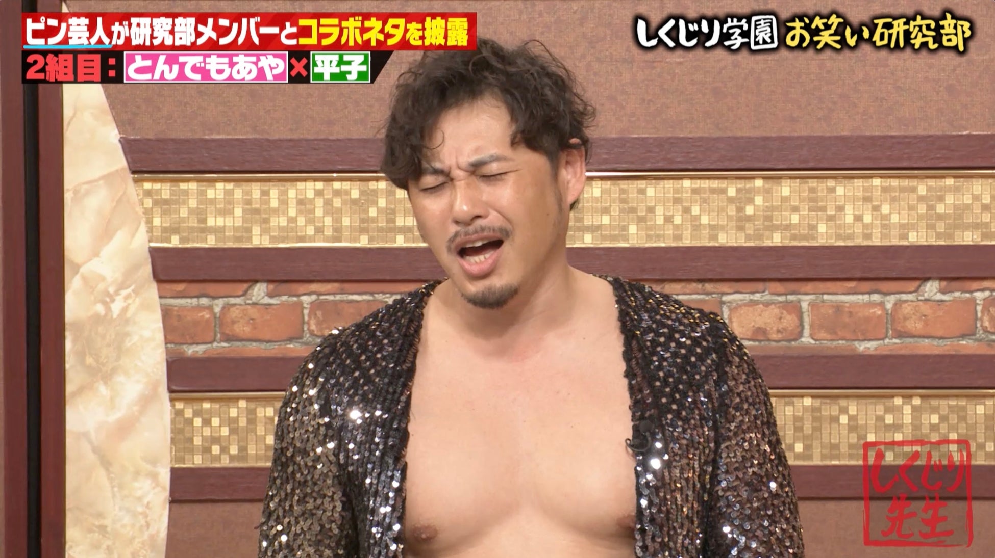 平子&とんでもあやは、両者のキャラクターを活かした“お色気漫才”を披露。開口一番、平子が「まだ何も始まってないじゃないか。どうしたんだい?」と語りかけると、とんでもあやは「あなたがセクシーすぎて…」と過剰反応。以降、平子の“フェロモンたっぷりな言葉”と、とんでもあやのときめきリアクションが止まらない異色の掛け合いが展開され、研究部メンバーは「すごい!」「素晴らしい」と称賛。審査員として出演したタレント・福留光帆も「平子さんのイケボが良いですね」と、平子の“セクシーさ”に注目しました。