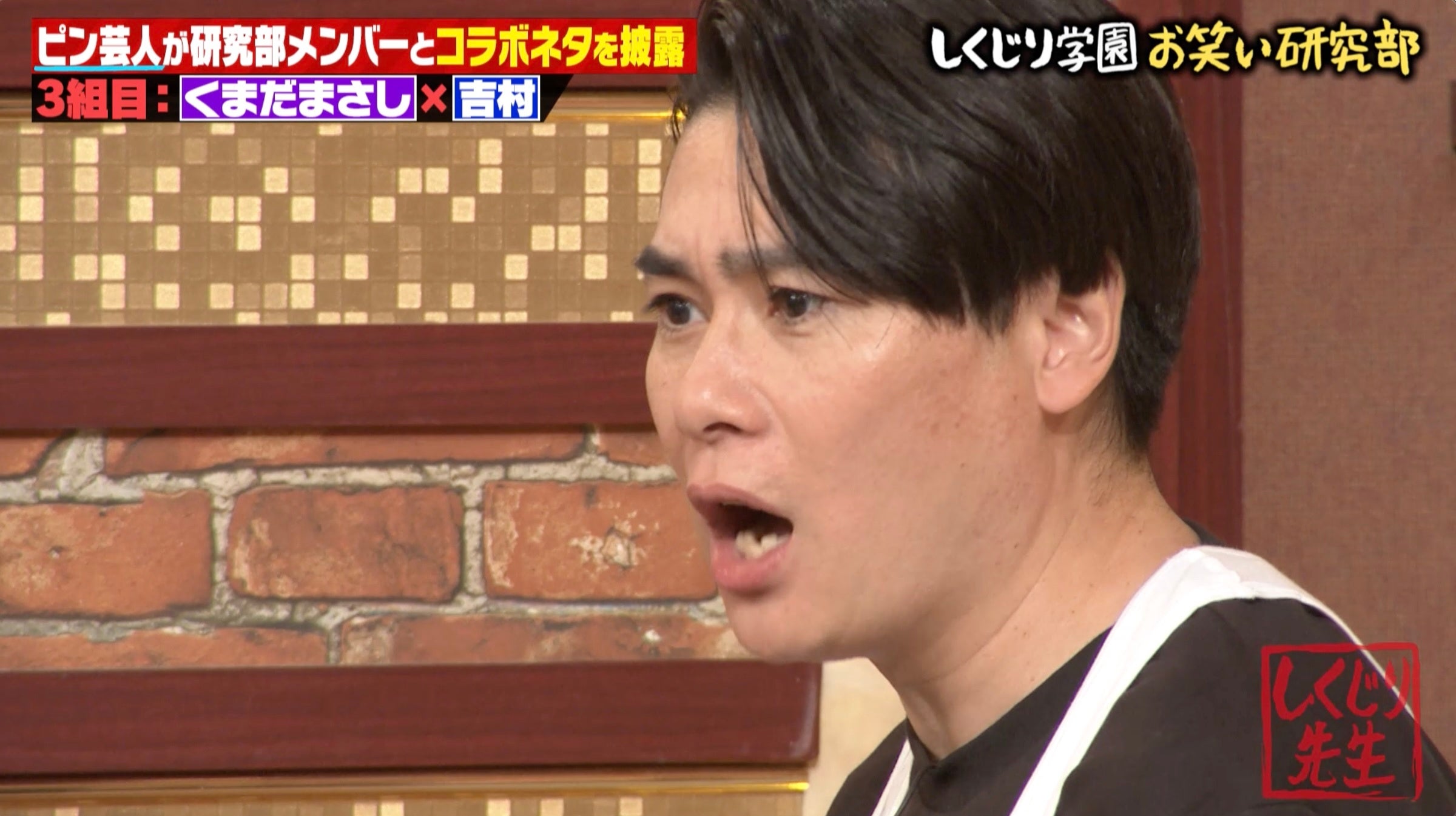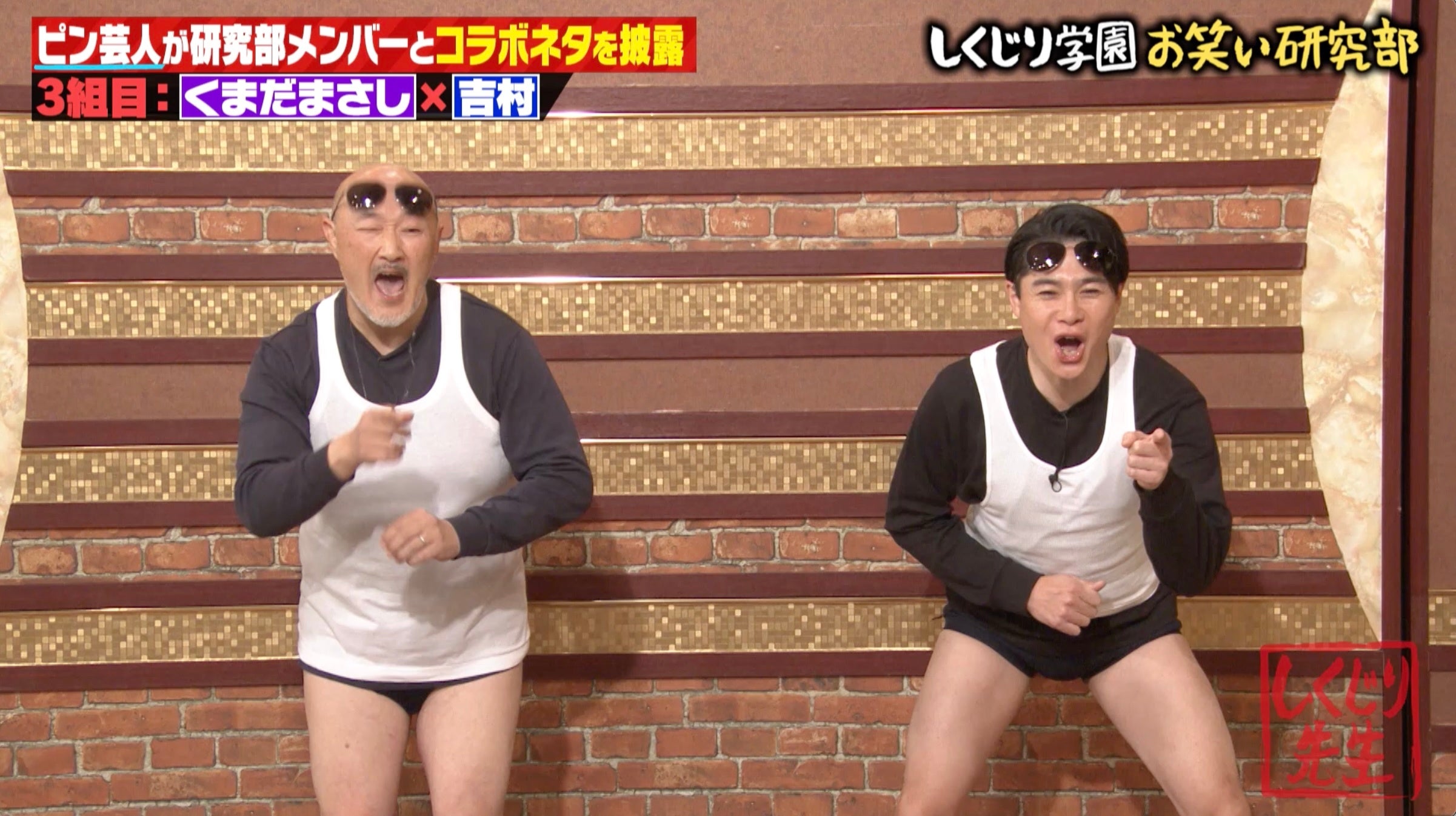 続いて、吉村&くまだまさしペアは、サングラスを上下させるくまだまさしの“サングラス芸”で笑いをとり、スタジオの期待がいっきに高まりましたが、「新ネタをやれ!」「コラボなんだから!」と求める吉村に対し、くまだは「俺のやりたいようにやる!」と譲らず、ネタの途中で“喧嘩”に発展。小道具を取り上げて阻止するも、頑なに自身のネタを続行するくまだに、吉村は「お前一生ピン芸人でやってけ!」と突き放して…。これには若林も「こんな目に遭ってるくまださん見たことない」とコメント。長年の関係性がある2人だからこその“ガチ喧嘩コント”にスタジオは大盛り上がりとなりました。