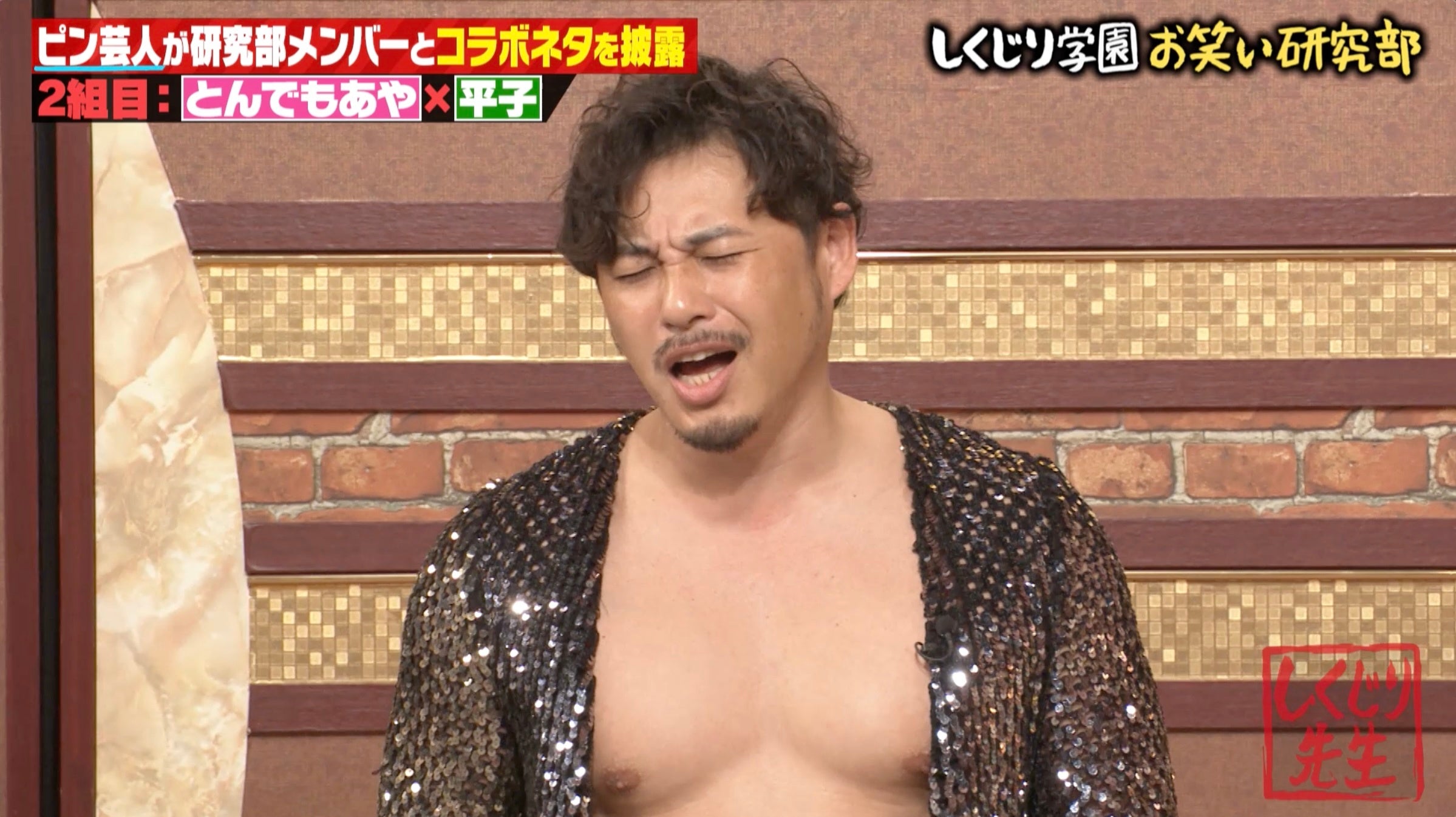 平子&とんでもあやは、両者のキャラクターを活かした“お色気漫才”を披露。開口一番、平子が「まだ何も始まってないじゃないか。どうしたんだい?」と語りかけると、とんでもあやは「あなたがセクシーすぎて…」と過剰反応。以降、平子の“フェロモンたっぷりな言葉”と、とんでもあやのときめきリアクションが止まらない異色の掛け合いが展開され、研究部メンバーは「すごい!」「素晴らしい」と称賛。審査員として出演したタレント・福留光帆も「平子さんのイケボが良いですね」と、平子の“セクシーさ”に注目しました。