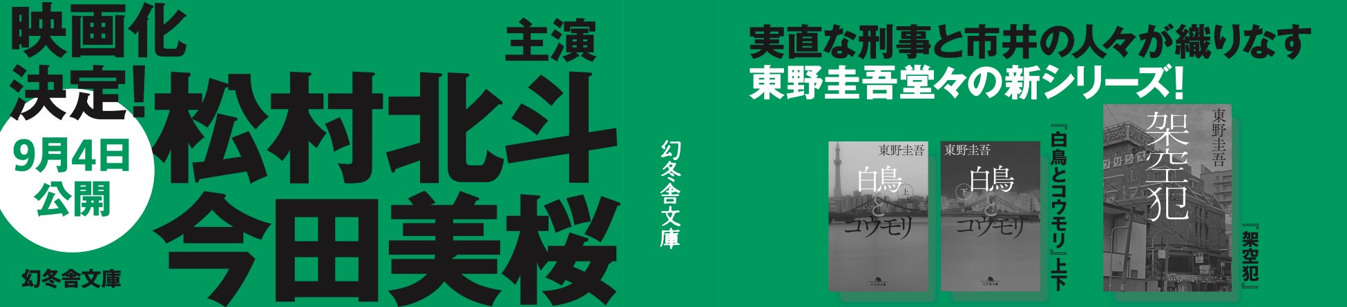 この度、シリーズ累計発行部数 150 万部突破の東野圭吾氏による、新たなる最高傑作『白鳥とコウモリ』 (幻冬舎文庫)が、松村北斗氏と今田美桜氏の W 主演により実写映画化し、9 月 4 日(金)に全国公開することが決定いたしました。