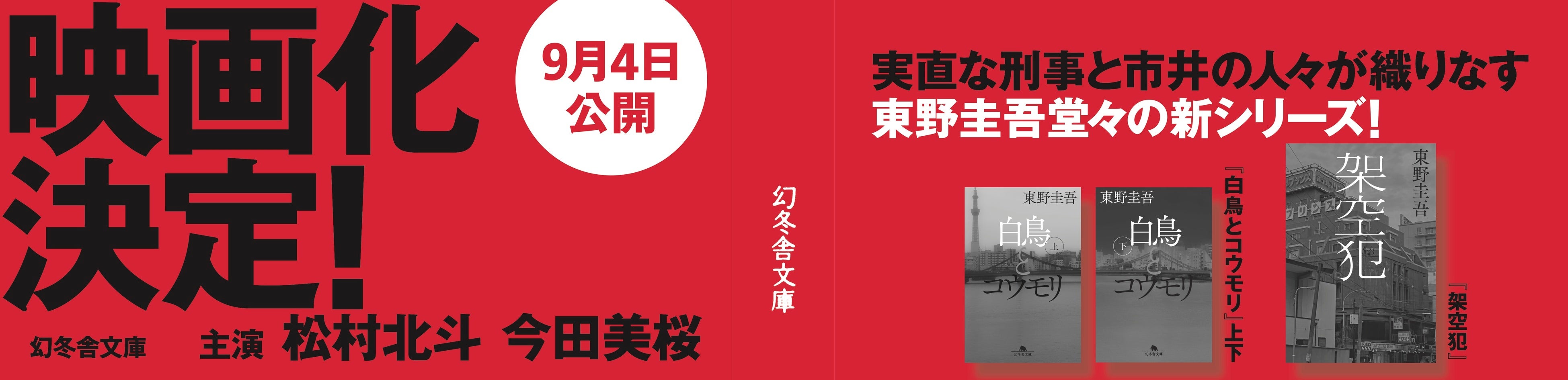 この度、シリーズ累計発行部数 150 万部突破の東野圭吾氏による、新たなる最高傑作『白鳥とコウモリ』 (幻冬舎文庫)が、松村北斗氏と今田美桜氏の W 主演により実写映画化し、9 月 4 日(金)に全国公開することが決定いたしました。