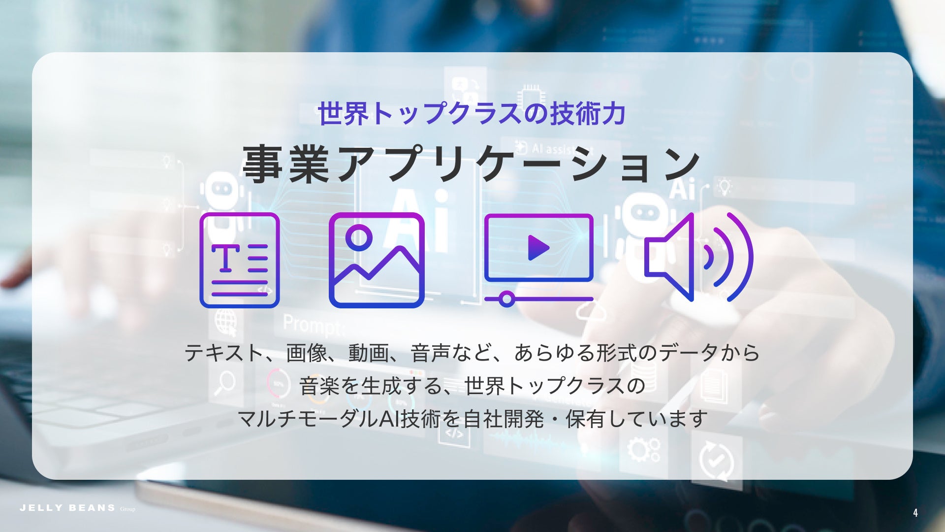 写真、テキスト、動画等の入力データから、AIが瞬時に感情や背景を解析し、専門知識を必要とせずに高品質なオリジナル楽曲を生成します。日本語、英語、中国語を含む多言語に対応し、グローバルな展開を視野に入れています。