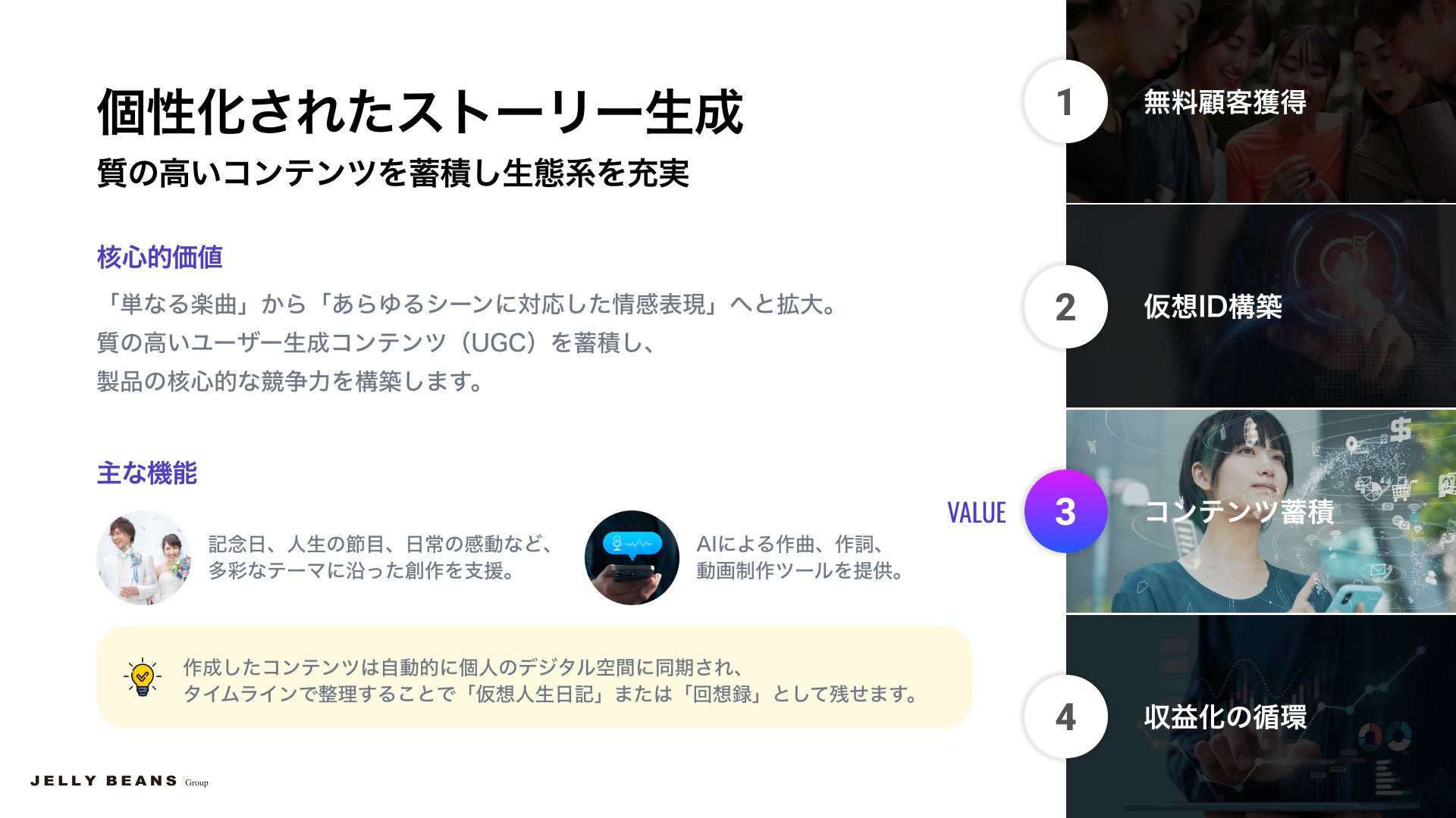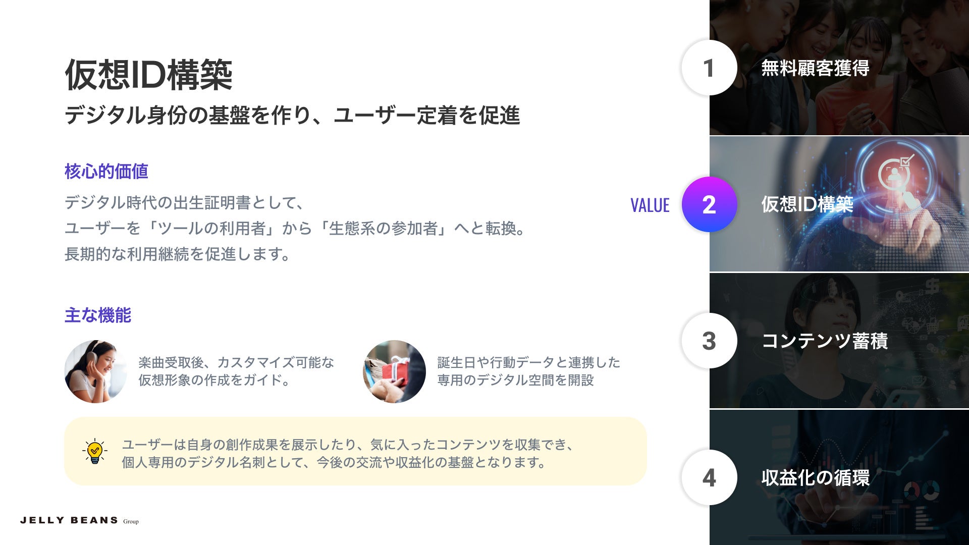 フォトロイドミュージックが日本市場向けに構築したモデルは、ユーザーのライフサイクル全体のニーズを核心に据え「無料顧客獲得 – 仮想ID構築 – コンテンツ蓄積 – 収益化の循環」という完全な連鎖を構築しています。
