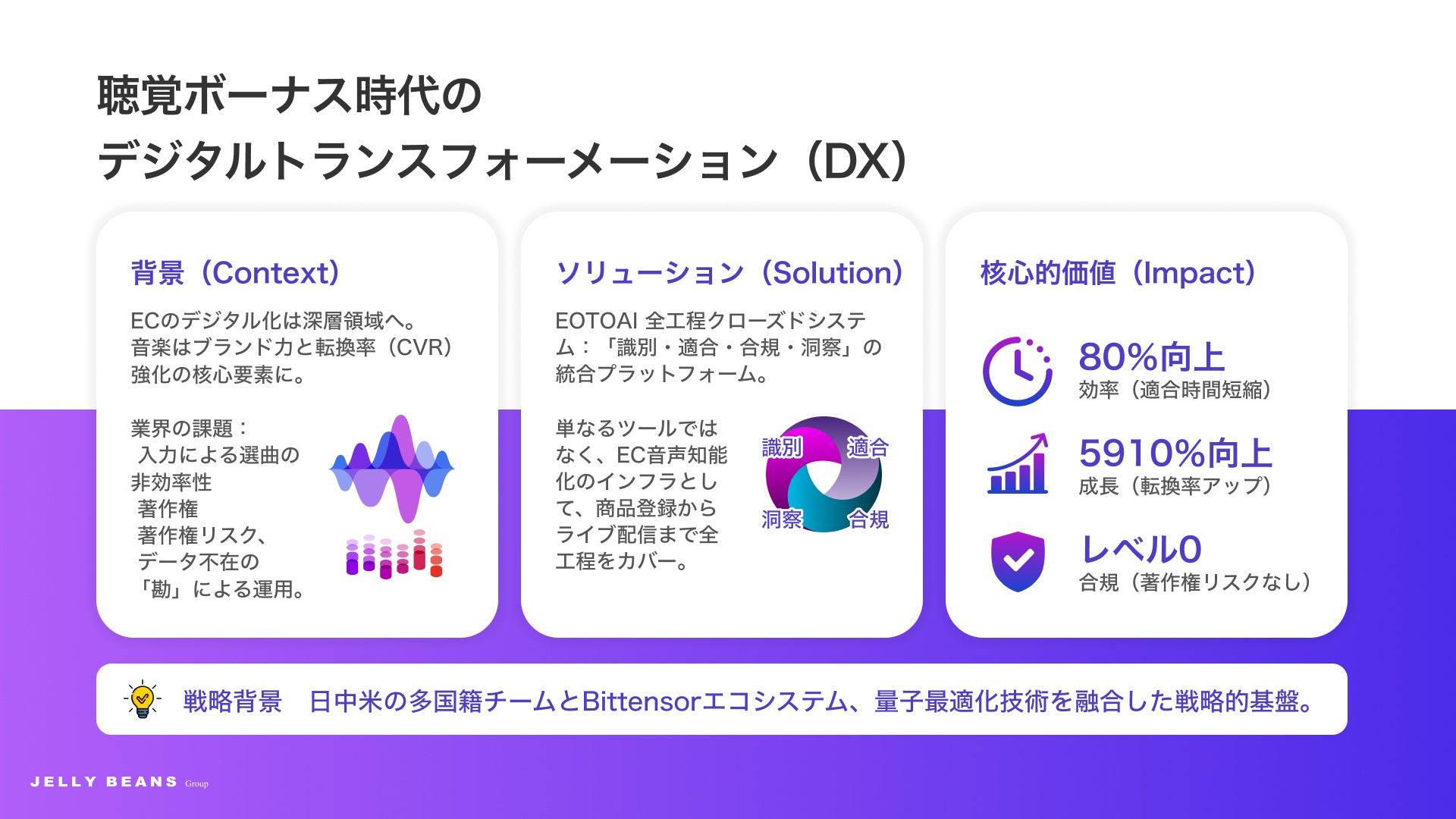 写真、テキスト、動画等の入力データから、AIが瞬時に感情や背景を解析し、専門知識を必要とせずに高品質なオリジナル楽曲を生成します。日本語、英語、中国語を含む多言語に対応し、グローバルな展開を視野に入れています。