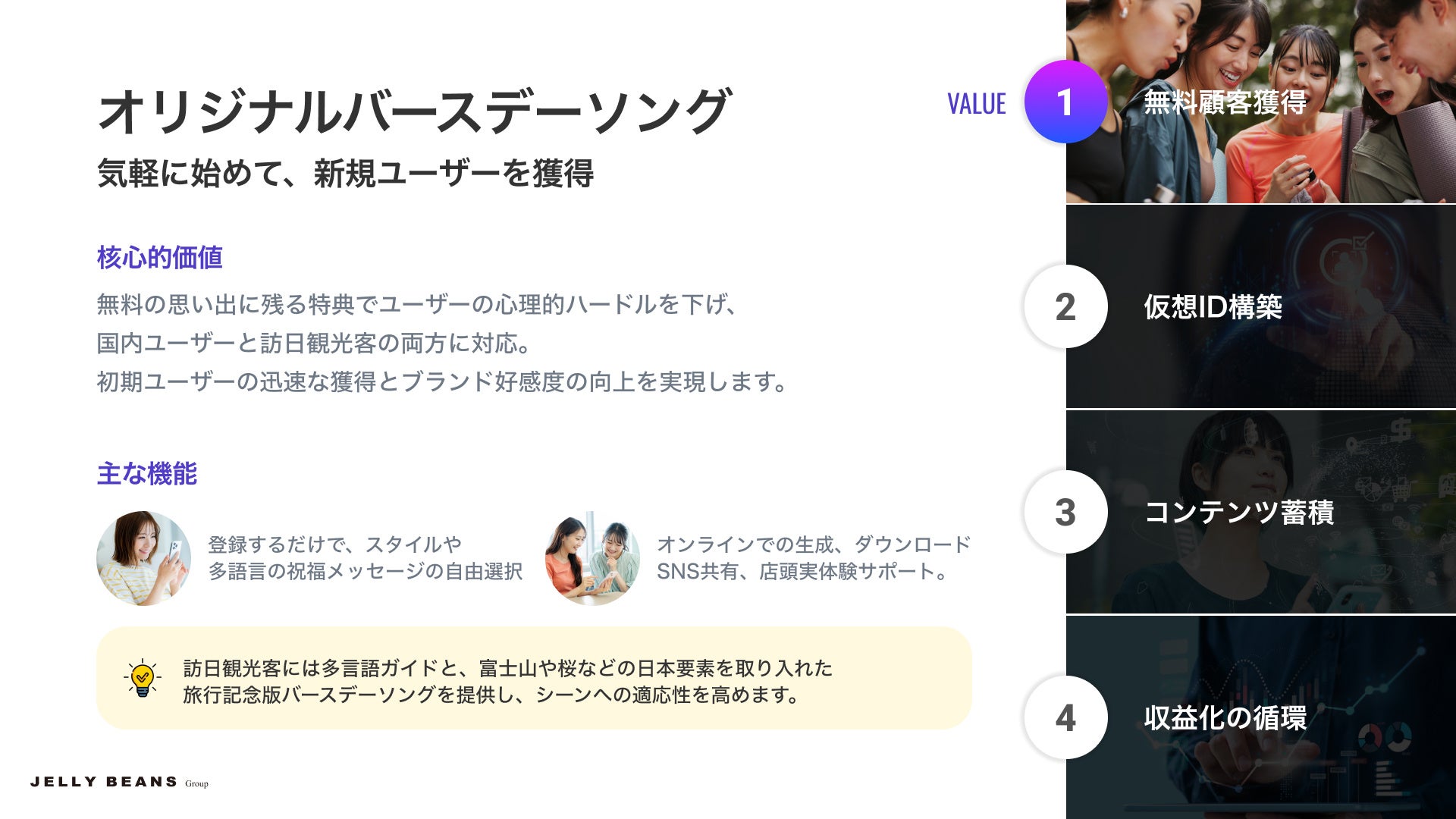 コンビニ・商業施設・コミュニティセンターに体験コーナーを設置。食事記録、家族団らん、記念日など日常シーンで楽曲生成サービスを提供。QRコード読み取りで登録後は誕生日曲の無料カスタマイズ権を付与。