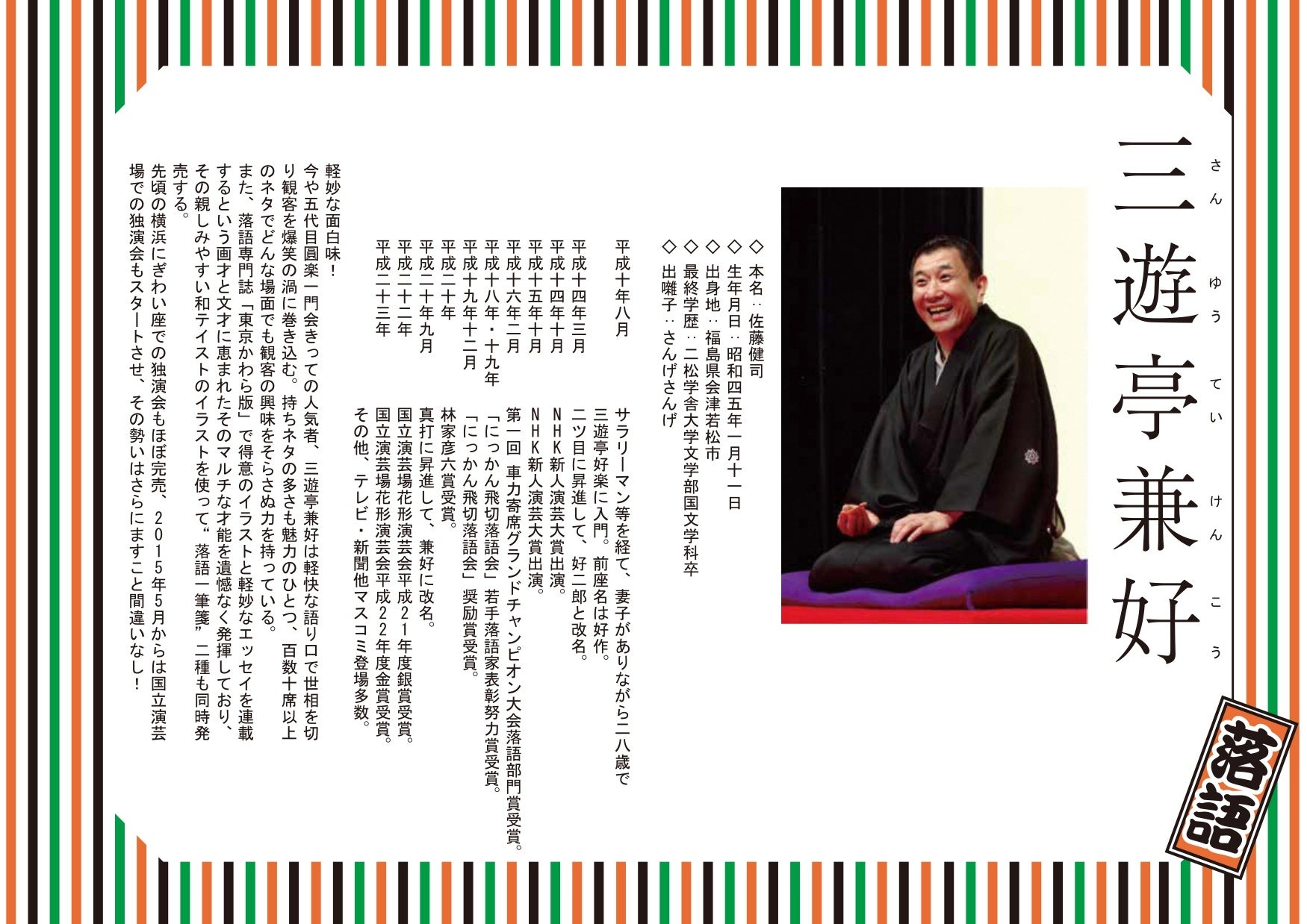 1970年1月11日生まれ、福島県会津若松市出身。1998年、三遊亭好楽に入門。真打に昇進して、兼好に改名。