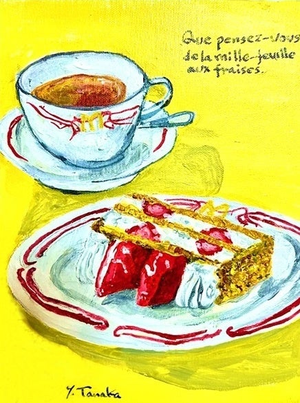 「マキシム・ド・パリ」で培われた至高のホスピタリティと、パリ・東京の二つの都市で磨かれた感性。田中氏が描く世界には、美食の殿堂を彩ったスイーツや愛らしい動物たちが、鮮やかかつ温かなタッチで描かれています。今回の展示タイトル「C’est la vie(セ・ラ・ヴィ)」には、変化し続ける人生を肯定し、日常の中にある輝きを愛でる田中氏の哲学が込められています。