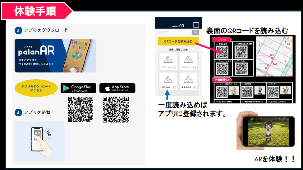 現実の街並みとデジタル映像が融合したXR作品を体験できます。