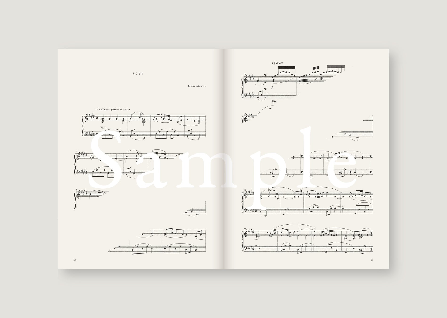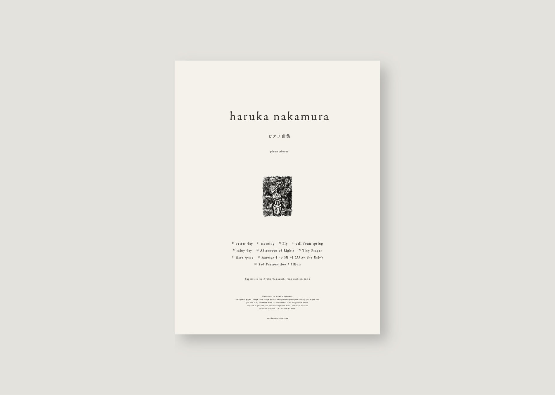 本展のために制作された「ピアノ曲集」は、haruka nakamuraのピアノ作品のなかからリクエストの多かった10曲を楽譜化したもので、初めてのオフィシャル楽譜となります。楽譜とともに、haruka nakamura自身が各曲の内容や情景について綴っているほか、写真も収録されています。