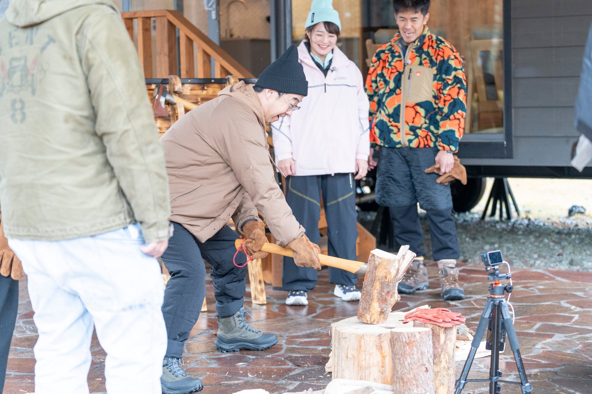 基地づくりが終わると、西村から「運動を兼ねて薪を割りましょう!」との提案が。ここで自信満々に名乗りを上げたのが、自称経験者の小木。しかし、意気揚々と振り下ろした1投目は斧の柄に薪がヒットし、小木の手がしびれるという結果に…。この予想だにしない展開に出演者もスタッフも大爆笑!