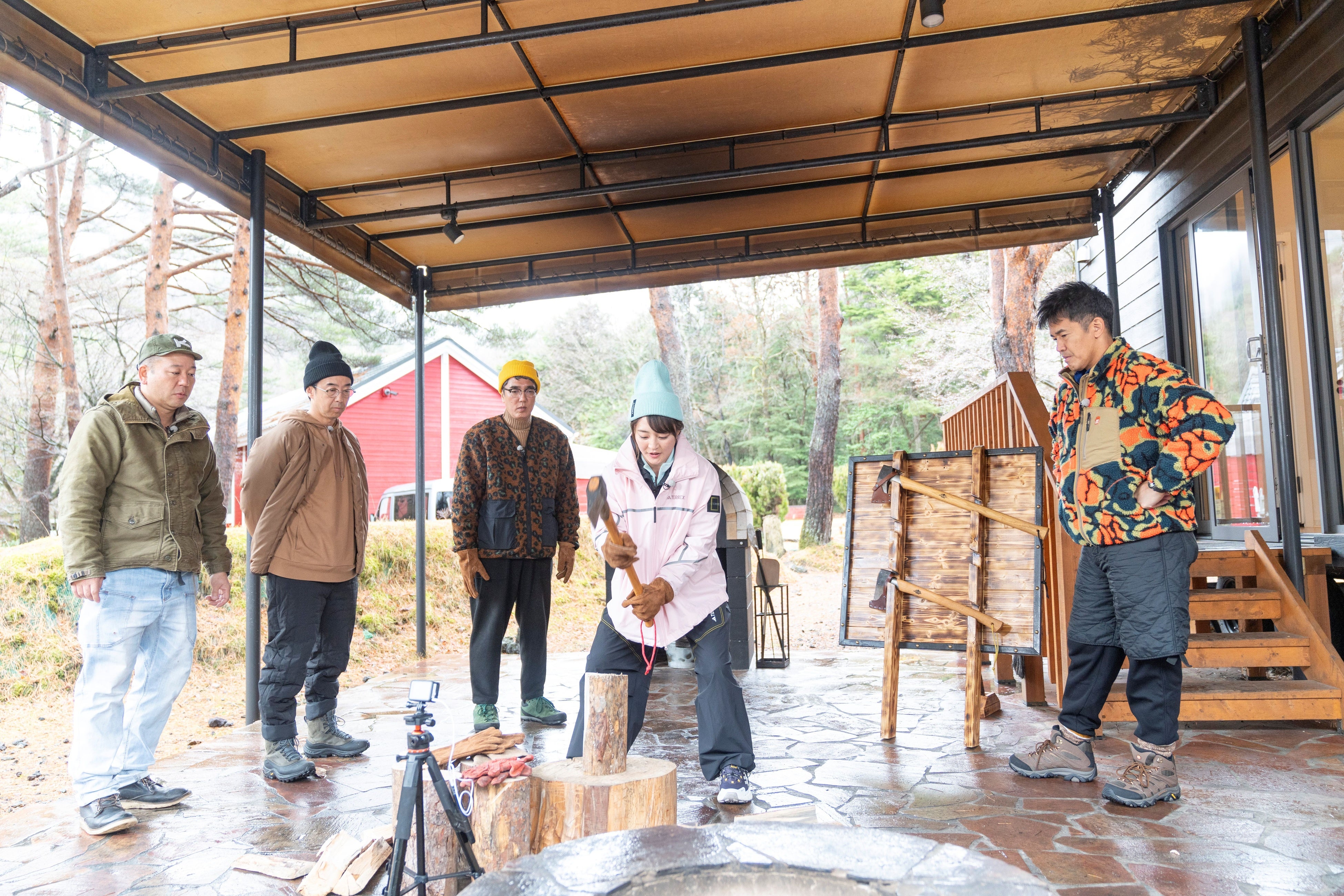 基地づくりが終わると、西村から「運動を兼ねて薪を割りましょう!」との提案が。ここで自信満々に名乗りを上げたのが、自称経験者の小木。しかし、意気揚々と振り下ろした1投目は斧の柄に薪がヒットし、小木の手がしびれるという結果に…。この予想だにしない展開に出演者もスタッフも大爆笑!