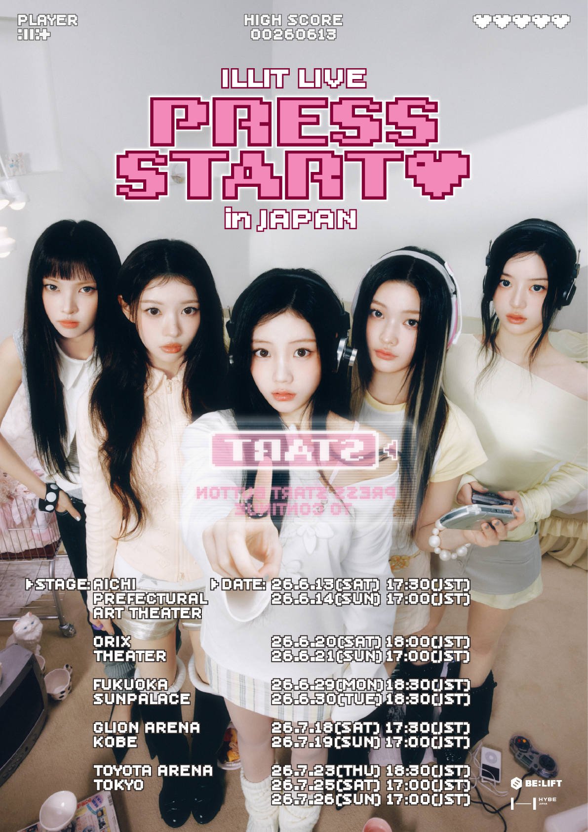 ”K-POP第5世代ガールグループ強者”ILLIT(アイリット)の初のライブツアーの日本公演『ILLIT LIVE ‘PRESS START︎︎❤’ in JAPAN』(以下「PRESS START︎︎」)の詳細が決定しました。6月13日・14日の愛知・愛知県芸術劇場 大ホールを皮切りに、6月20日・21日に大阪・オリックス劇場、6月29日・30日に福岡・福岡サンパレス、7月18日・19日に兵庫・GLION ARENA KOBE、7月23日・25日・26日に東京・TOYOTA ARENA TOKYOで5都市11公演を開催します。愛知・福岡・兵庫・東京での単独公演は初めてとなり、より多くの場所でファンの皆さんとお会いできる公演に多くの期待が寄せられています。