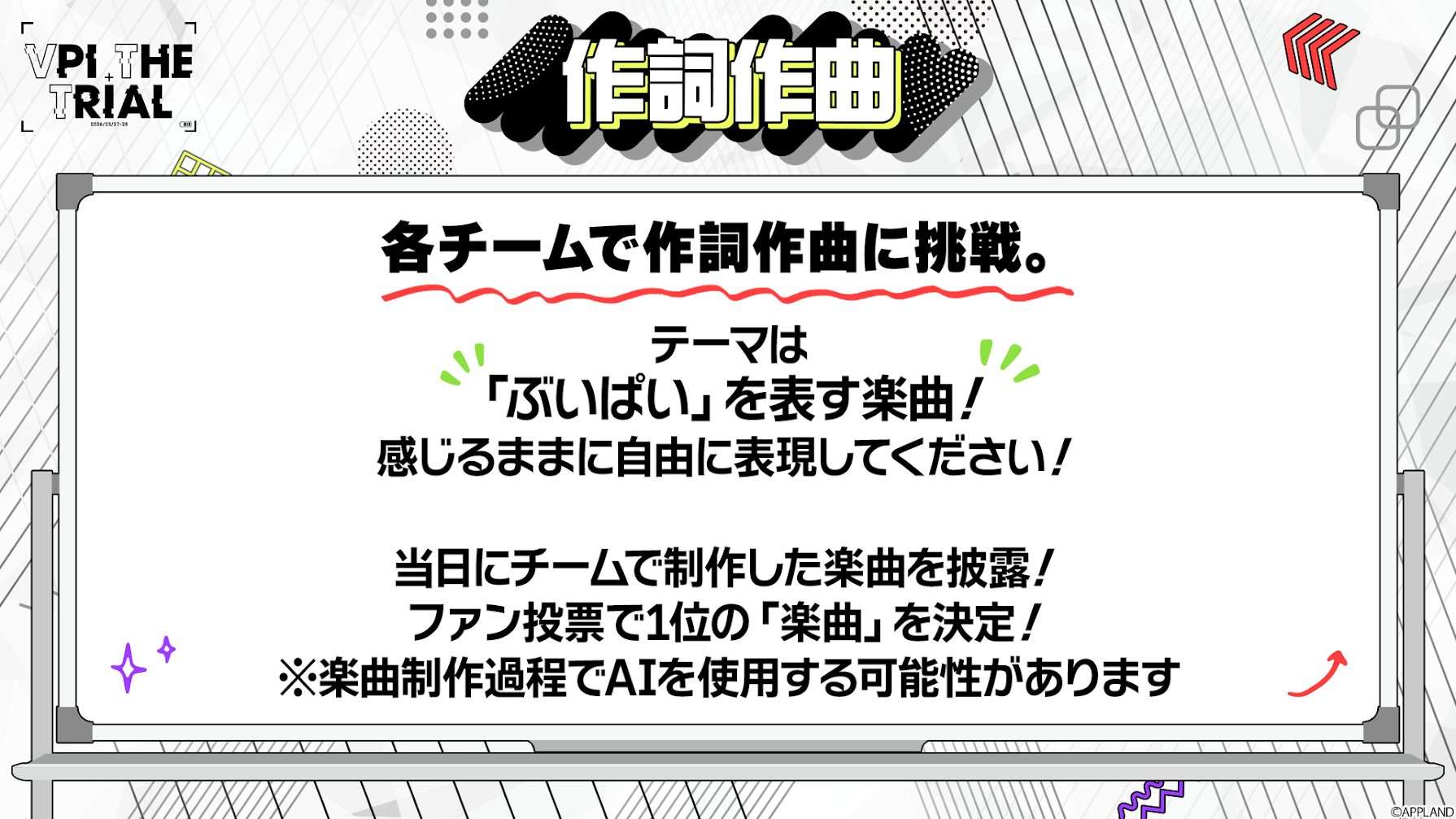 各チームで「ぶいぱい」を表現する楽曲の制作に挑戦し、当日のステージで披露。
