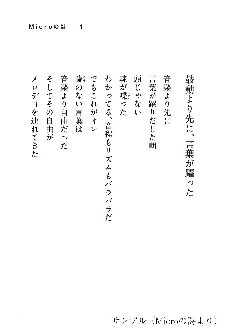 各章の合間には、Microによる短編詩を挿入。さらに、それらの詩は Micro本人の朗読音声を聴くことができる二次元コード付きで掲載。紙の上の言葉が、声となって立ち上がる仕掛けとなっている。