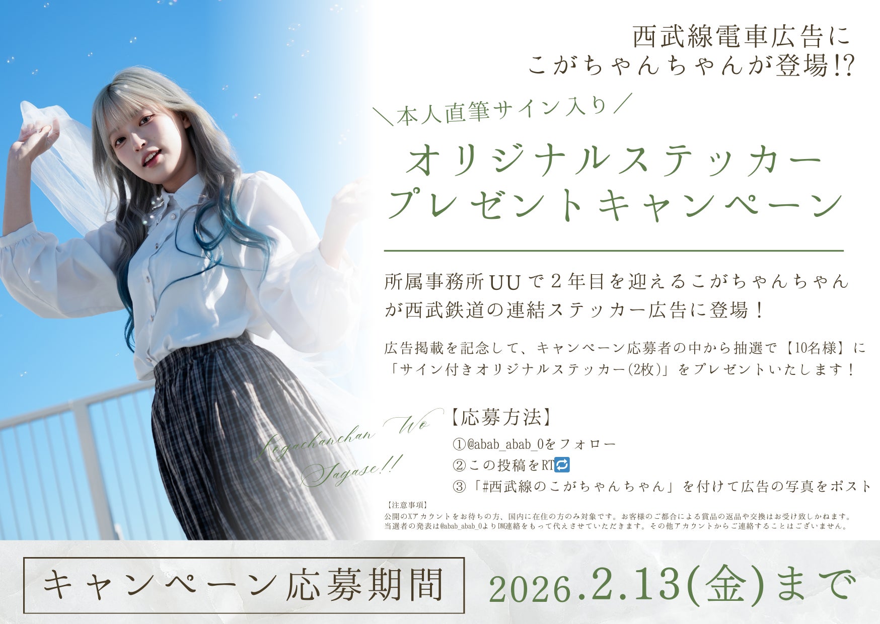 本キャンペーンでは、広告掲載を記念し、応募者の中から抽選で10名様に「本人直筆サイン入りオリジナルステッカー(2枚セット)」をプレゼントいたします!電車広告というオフライン施策と、こがちゃんちゃんのX(@abab_abab_0)上での参加型キャンペーンを組み合わせることで、ファンとの新たな接点創出を図ります。